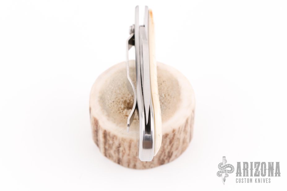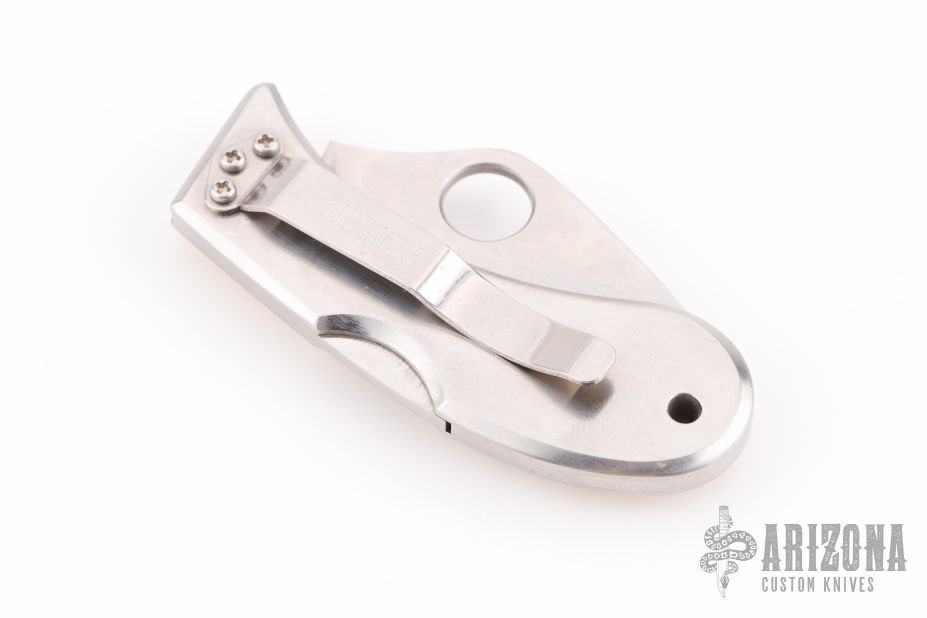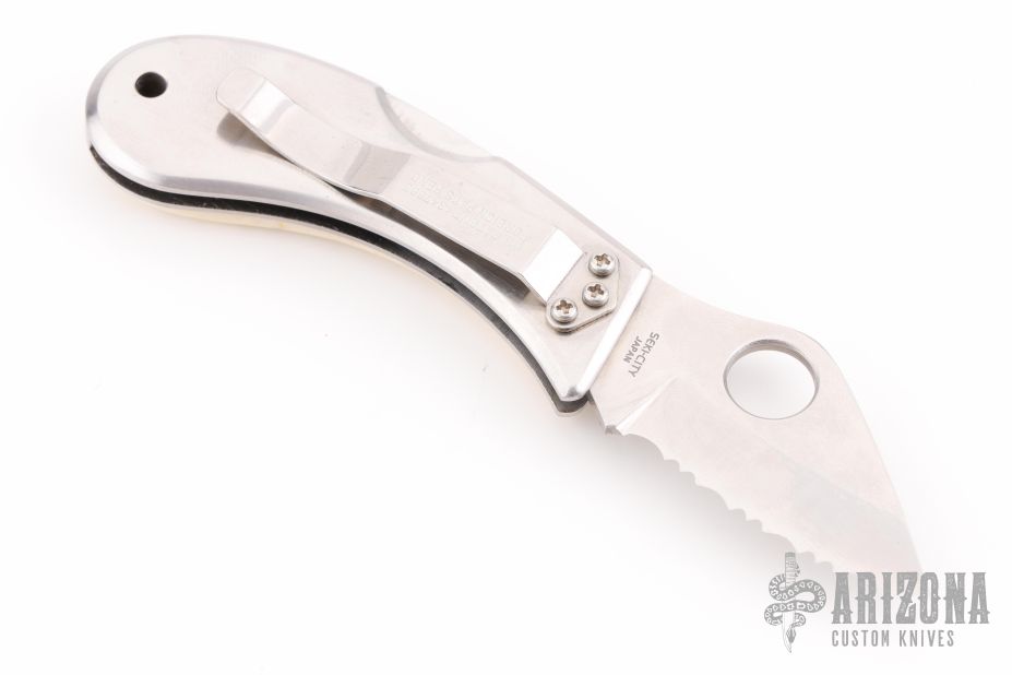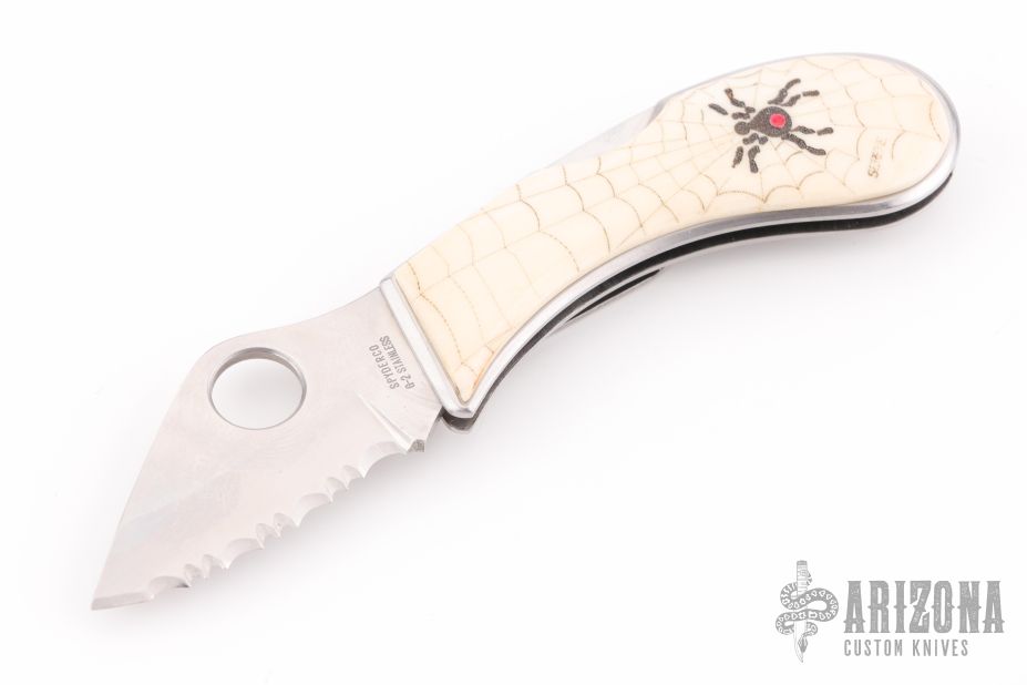 A versatile traveler, the Co-Pilot was originally created to meet airline standards worldwide. This classic Spyderco design is perfect as a money clip or a suit knife. This particular knife has a custom spider design scrimshawed on a bone scale on one side of the handle. Made in Seki City, Japan. Blade Steel: G-2 Stainless Steel