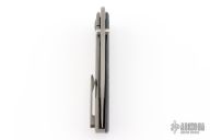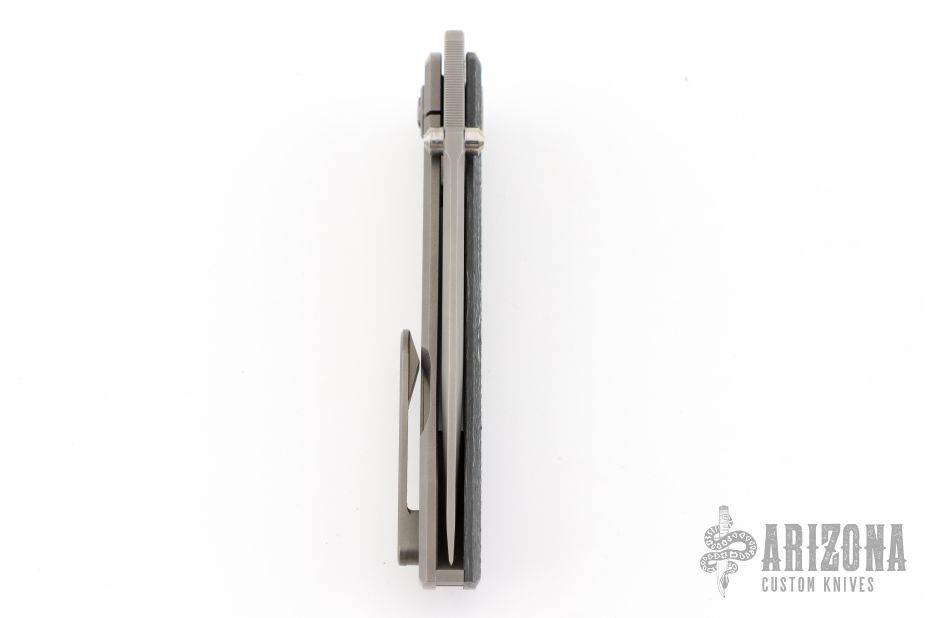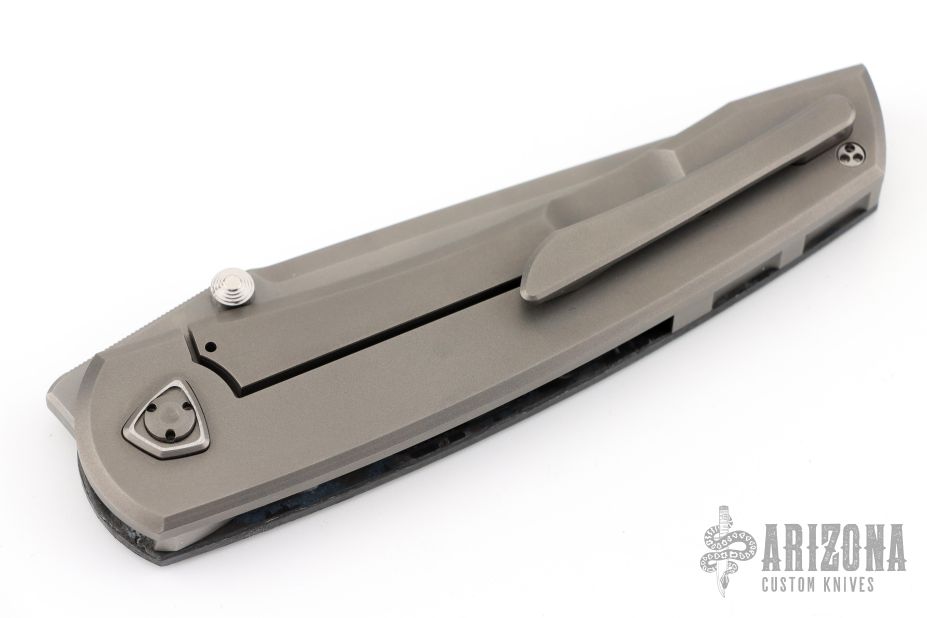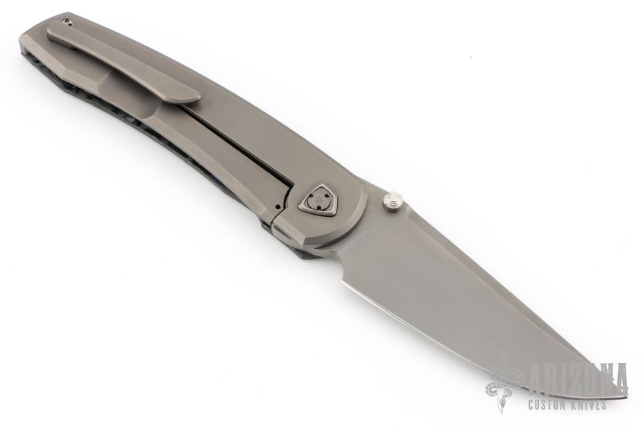 This Waka by Edison Barajas features a blasted blade with notched thumbrest and dual thumbstuds, can be front flipped. The handle has a chill vibes camocarbon and blasted titanium frame with matching backspacer and tip up clip. Has custom pivot. Rides on bearings, nice detent, lockup and blade seating. Comes with COA, dated 05-25. New from maker!