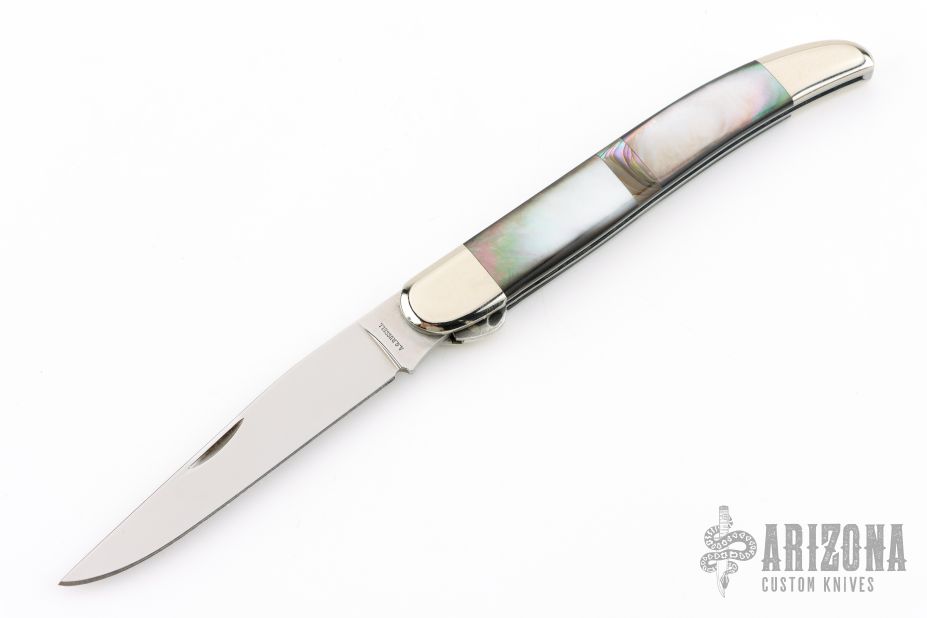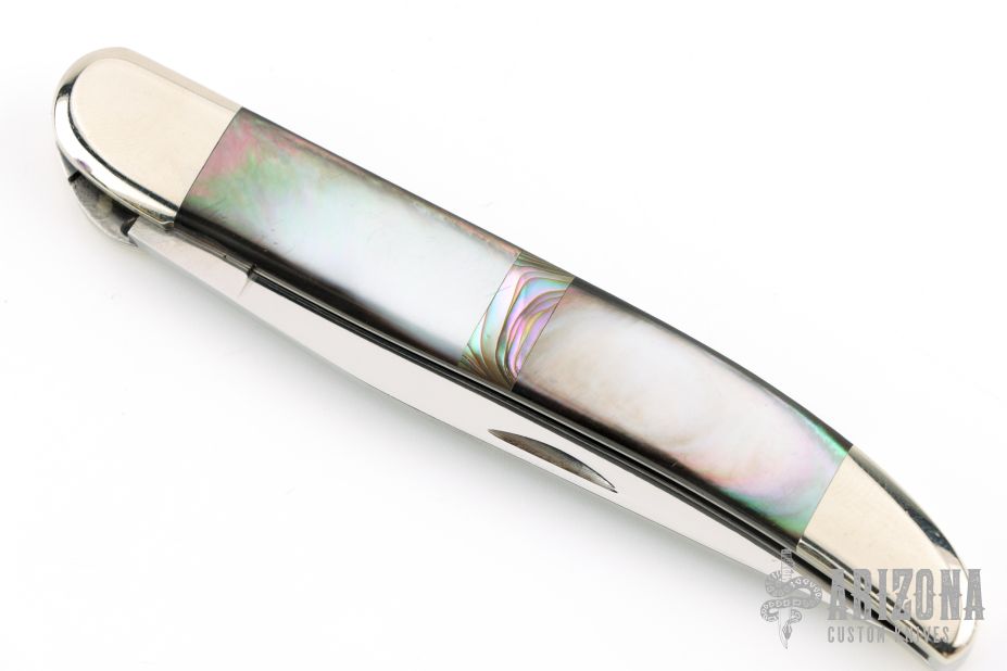 This knife from AG Russel features a mirror polished blade with nail nick. The handle has nickel silver bolsters, front and rear, black lip pearl and abalone inlays, and stainless steel liners. Has some light scratches, otherwise excellent condition.