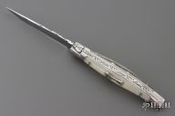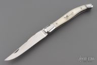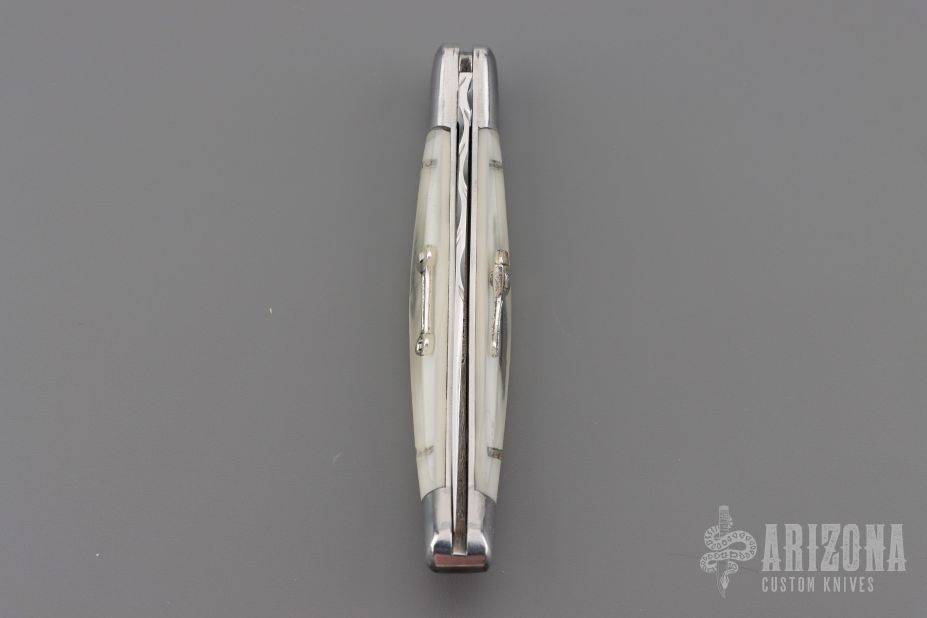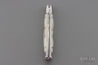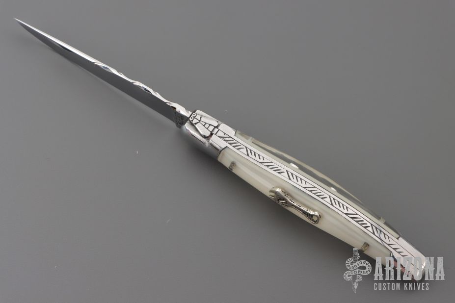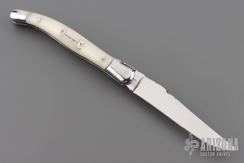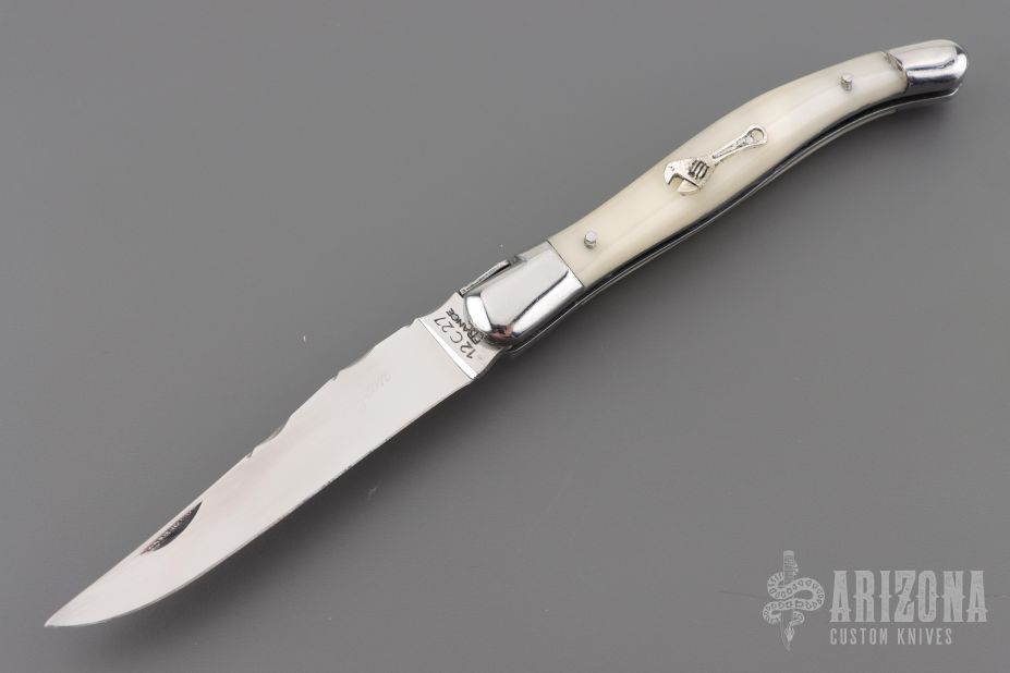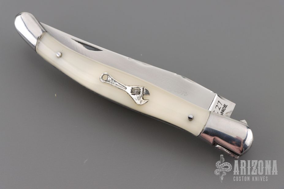 This Slipjoint by Laguiole features a mirror finished clip point blade with a nail nick and a fileworked spine.  The handle features stainless steel bolster, stainless steel liners, fileworked stainless steel backspring, clear/white covers with a miniature adjustable wrench inlay. Has a couple light scratches, otherwise good condition.