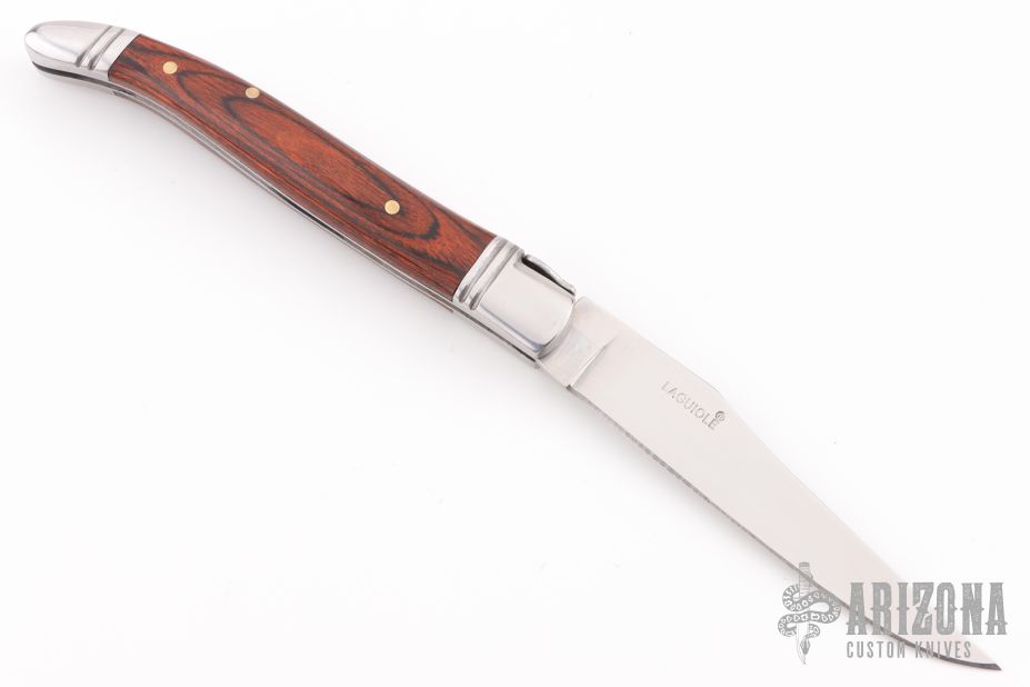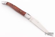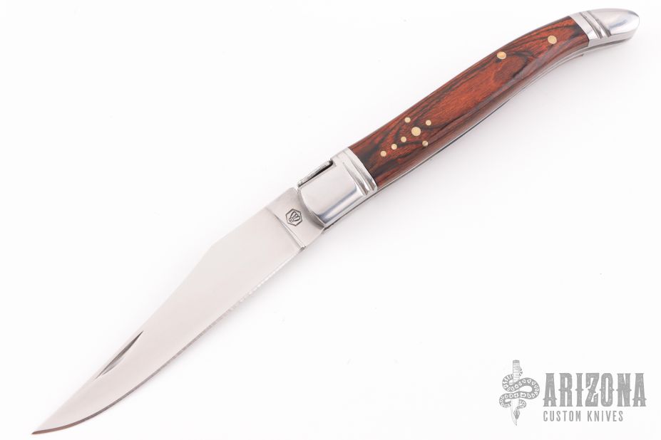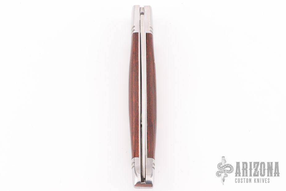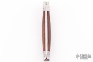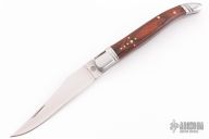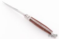 This knife features a mirror polished clip point blade with a single nail nick and a file worked thumb rest.  The handle features steel bolsters/liners over a steel backspring and wood covers.  File worked backspring. Comes in leather sheath with small hone. Excellent Condition.