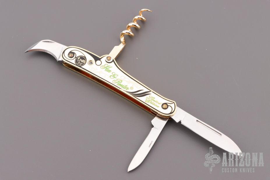 This Bartender's Knife by Hen & Rooster features mirror polished blades with nail nicks, cork screw on the back of the handle. The handle has brass covers and liners. Comes with original box. Excellent condition. 160th Anniversary since 1845. Has a viewing glass in the handle with the Hen and Rooster logo and 1885-2005.