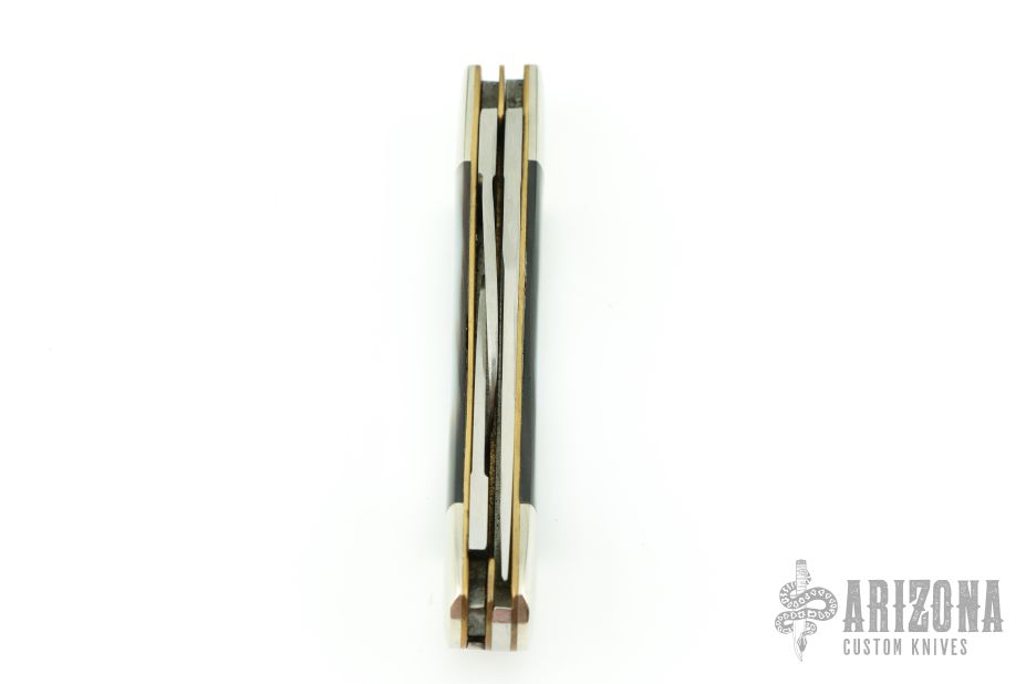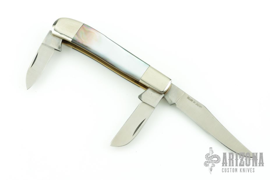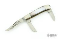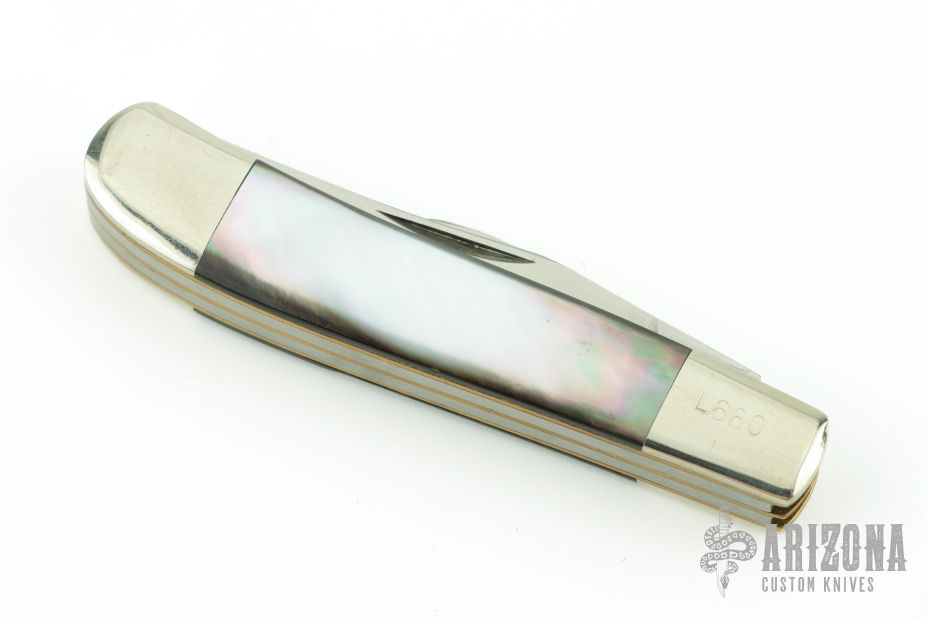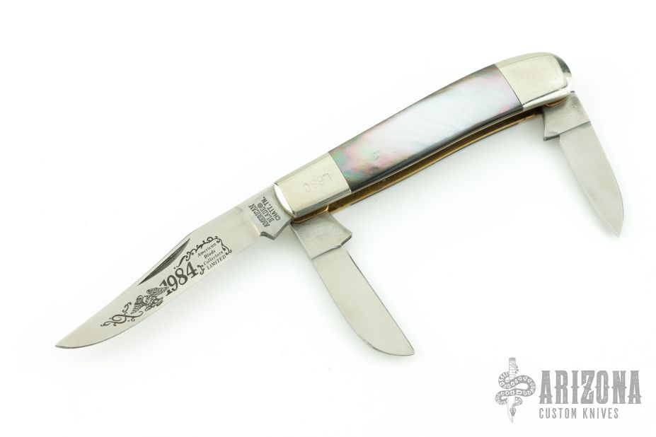 This knife for the American Blade Collectors Association is from 1984. It has satin finished blades with nail nicks. The handle has nickel silver bolsters, black lip pearl covers, brass liners, stainless steel springs. Has half-stops. #L680. Has a few light scratches, otherwise excellent condition.