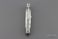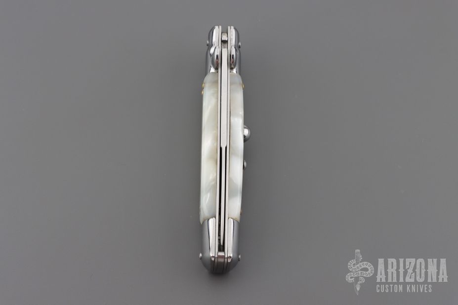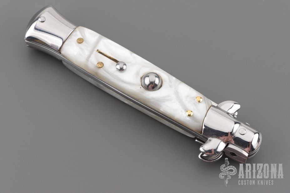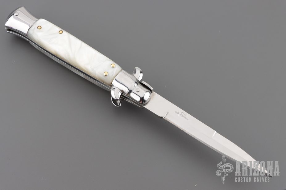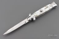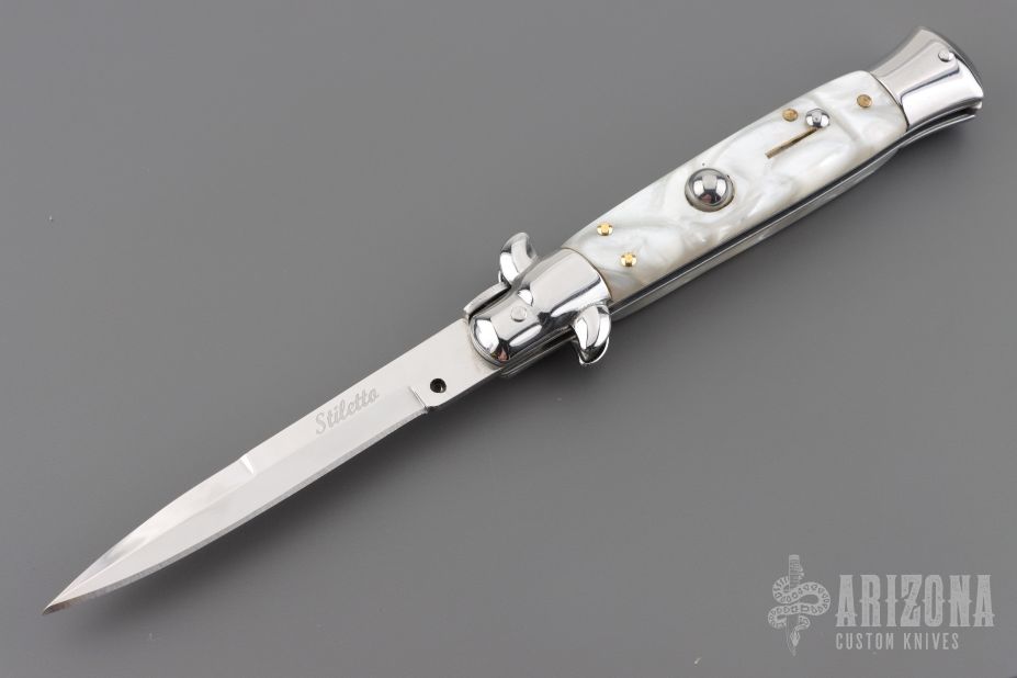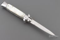 This 9" Picklock by Stiletto features a polished bayonet ground blade with false top edge. The handle has stainless steel bolsters, front and rear, pearled scales, brass liners, stainless spring. Excellent condition.