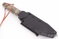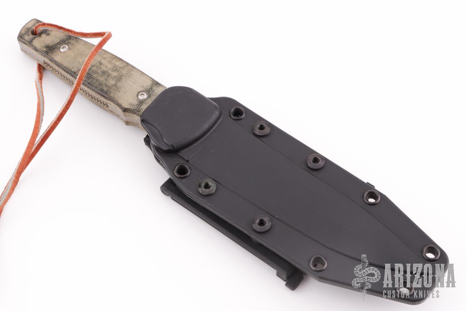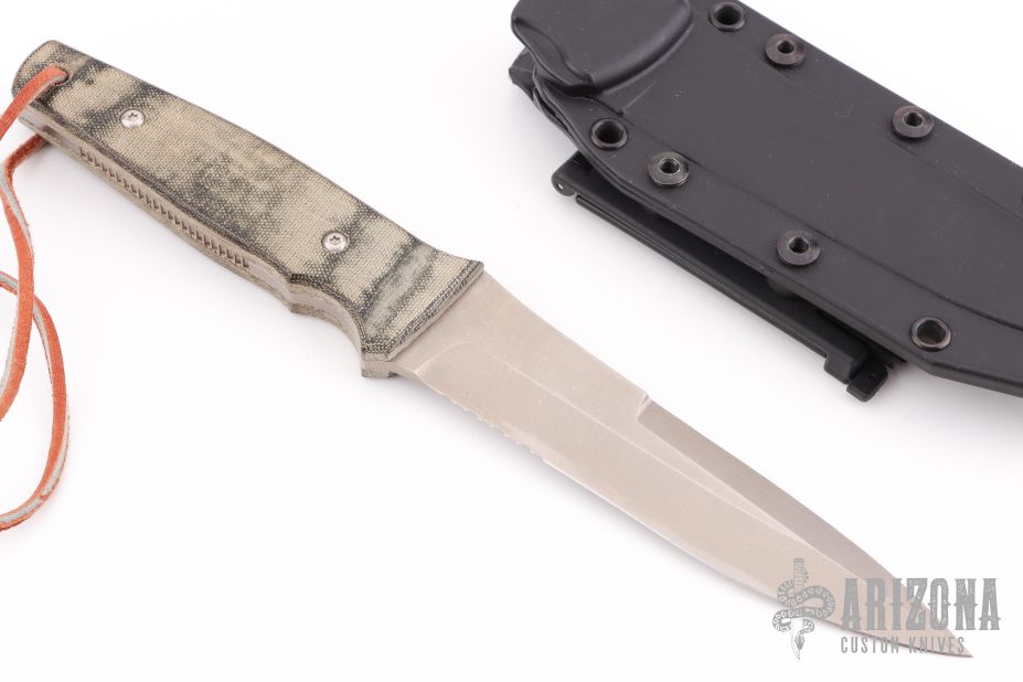This CQB1 from Meyerco was designed  by Bob Terzuola. It features a bead blast finished spear point blade with false top edge and notched thumb rest with partial serrations. The handle is comprised of green micarta over full tang construction with lanyard hole in pommel. Includes injection molded sheath with belt clips. .169" blade stock, 1.366" blade depth. Has some scuffs and scratches, great condition otherwise.