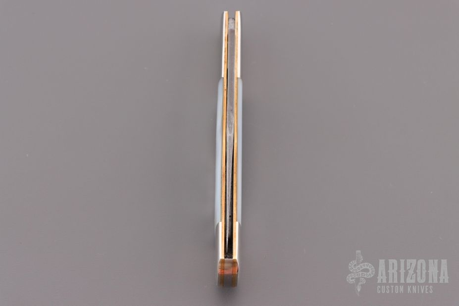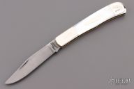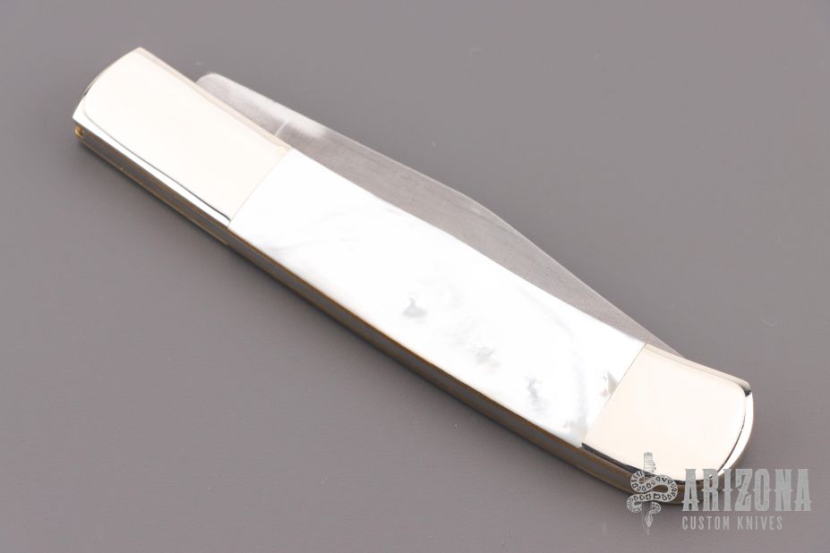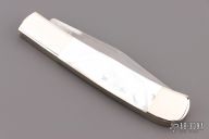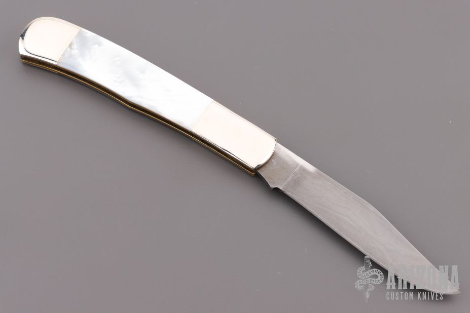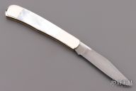 This slipjoint by the American Blade Collectors Association is from 1986. Parker-Edwards Damascus Trapper with nickel silver bolsters and escutcheon, mother of pearl covers, brass liners and stainless spring. Has some light scratches, otherwise excellent condition. #0819 of 3990.
