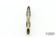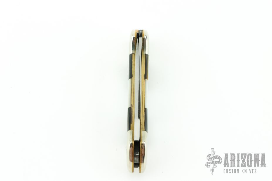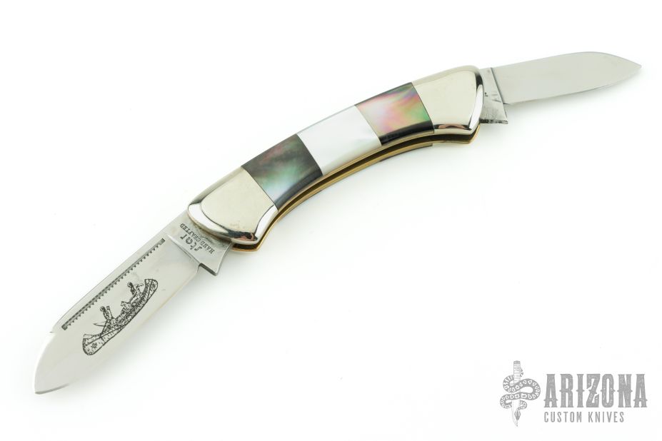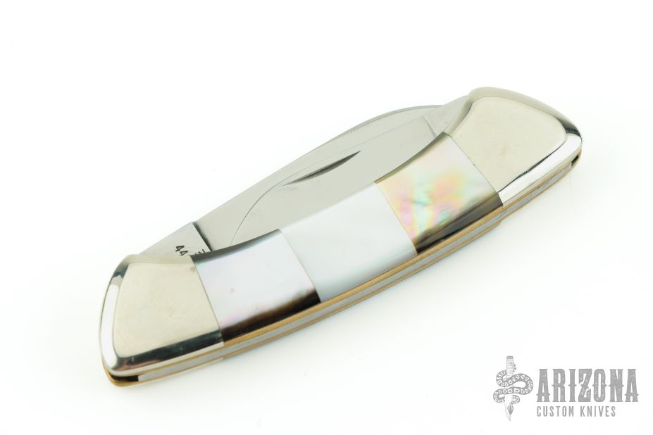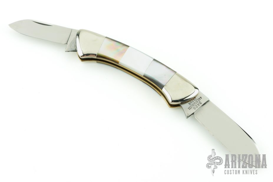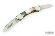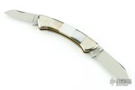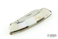 This Canoe slipjoint by Star features mirror polished blades with nail nicks. The handle has nickel silver bolsters and black/mother of pearl covers, brass liners and stainless steel springs. Has some light scratches, otherwise excellent condition.