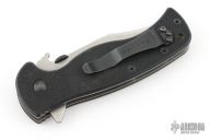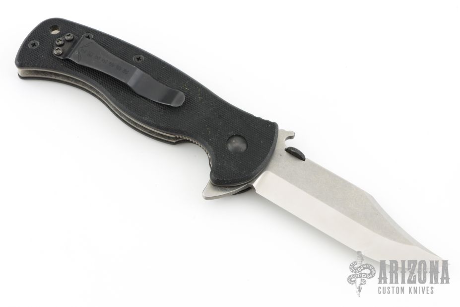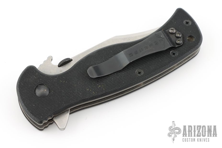 This Sheepdog from Emerson Knives features a stonewashed blade with notched thumbrest and flipper. Knife can be opened using the thumb disk, wave feature or flipper. The handle is comprised of black G10 scales over titanium liners with black barrel spacers and black stainless steel reversible pocket clip positioned for (right or left handed) tip up carry. Excellent condition. Comes with original box and papers. #0192