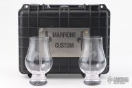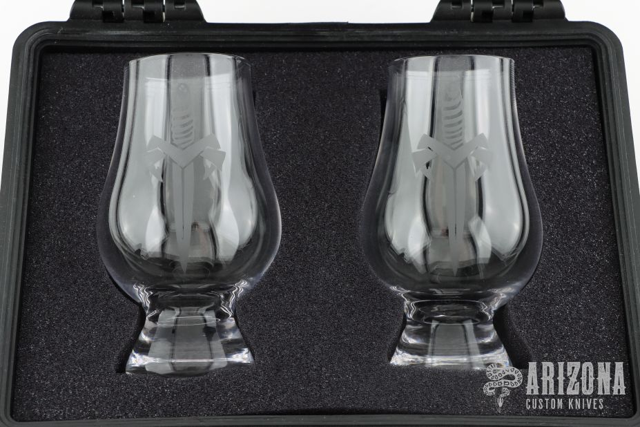 Comes in a hard case with clasps. Set includes two etched glasses, and plaque fastened to the case. New condition.