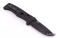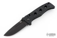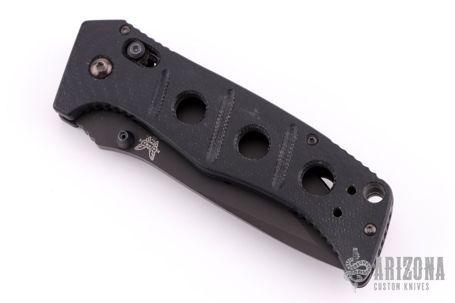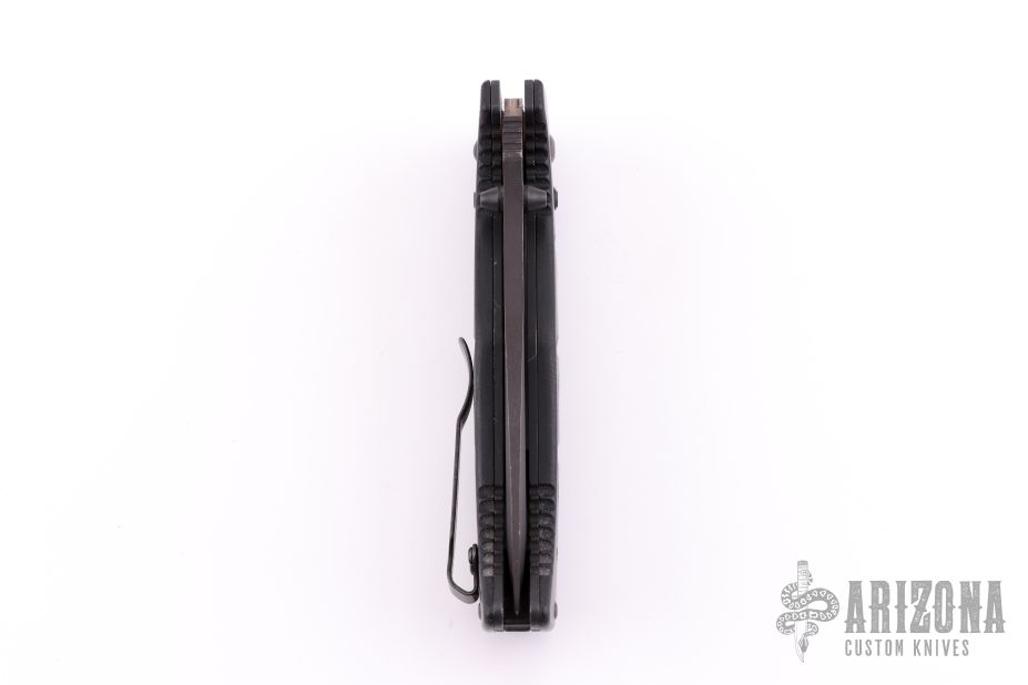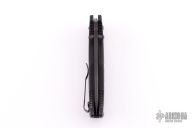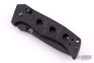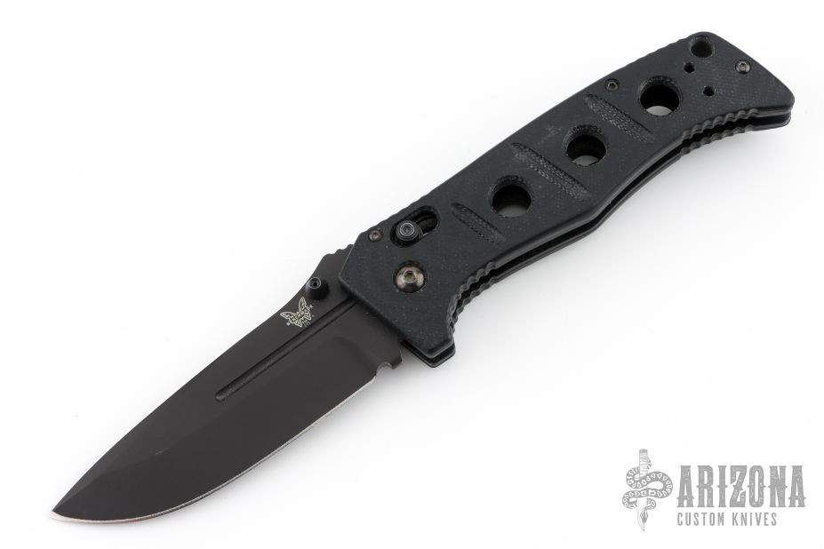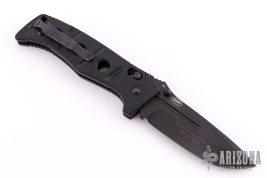 This Adamas by Benchmade is a Shane Sibert design, it has a black blade with dual thumbstuds, fullers and notched thumbrest. The handle has black G-10 scales, black stainless steel liners and tip up clip. Nice lockup and blade seating. Excellent condition. Comes with original box, sheath and papers. First Production #89 of 1000