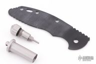 This pocket-size tool kit is a complete disassembly tool for the XM folder. It includes a built-in spanner wrench, which makes it very easy to hold both the wrench and the knife at the same time while making pivot adjustments. The head unscrews from the main body, which contains a precisely machined screwdriver blade that matches the slot on the pivot screw of the XM-18. The head will also hold any standard 1/4″ bit. In the case of the XM-18 it is a 5/64″ hex that works on the handle screws. The crossed drilled hole in the male end is there so you can use it as a “T” handle for extra torque. These are made from 17-4 PH hardened stainless steel, with a bead blast finish. Has a few scuffs, otherwise excellent condition.