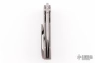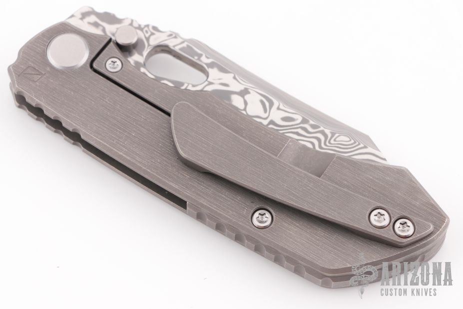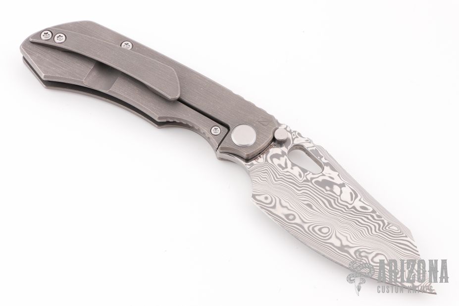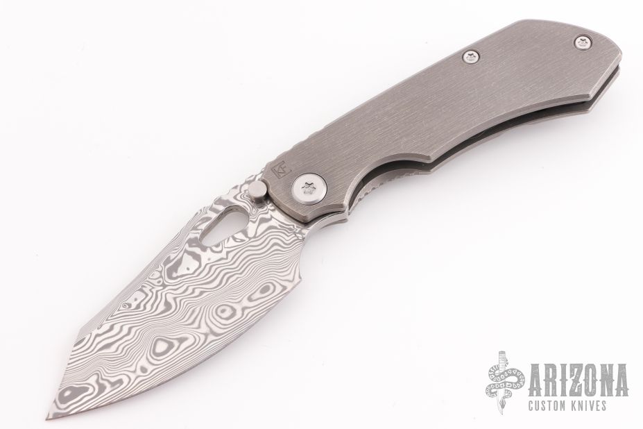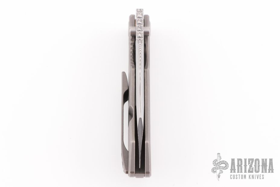 This Evolution 4.0 by Custom Knife Factory features a polished damasteel blade with notched thumbrest and thumbhole. The handle has a tumbled bark finished titanium frame with a notched backspacer and a matching tip-up pocket clip. Comes with maker's velcro case, extra hardware, and COA. Nice detent, lockup and blade seating.  #182 and dated 2-24.  Excellent condition.