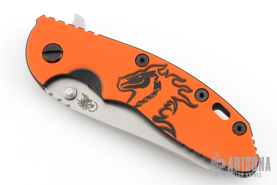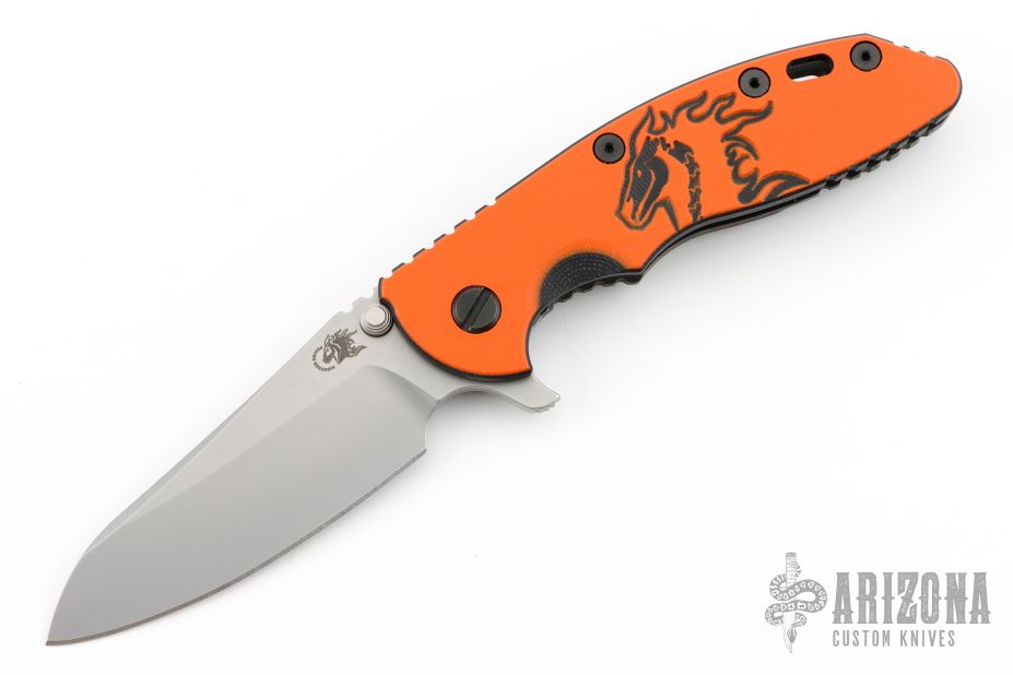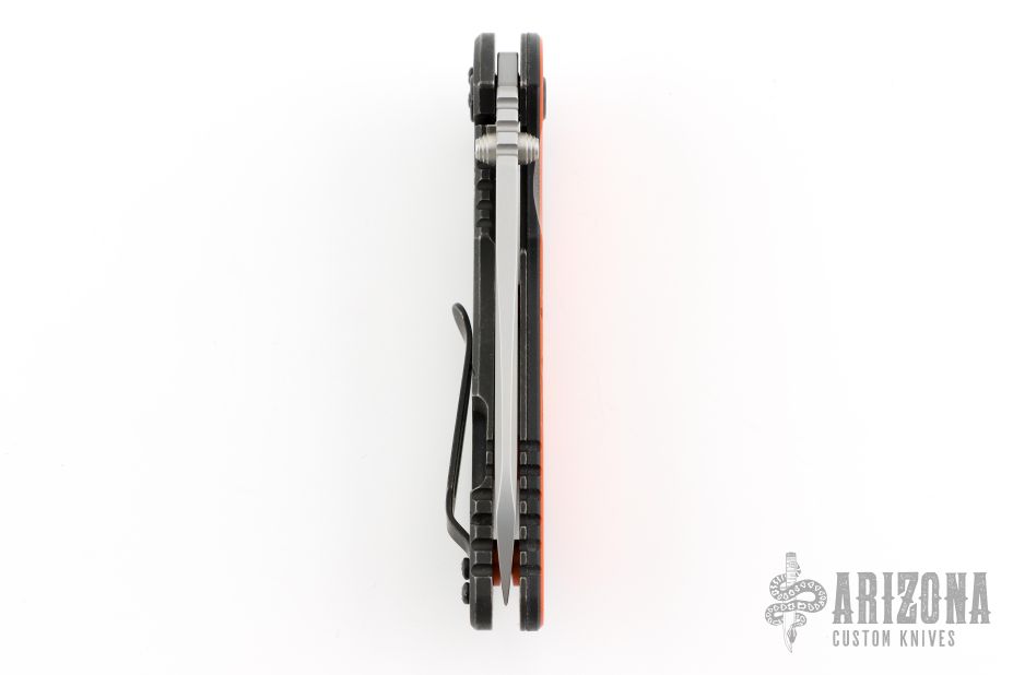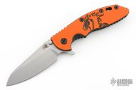 This Halloween XM-18 Sheepsfoot flipper from Rick Hinderer Knives features a 3.5" bead blast finished blade, notched thumbrest and flipper, dual thumbstuds. The handle has a black/orange G-10 scale, and a battle black finished titanium handle/clip with orange standoffs and black hardware. Clip can be mounted for tip up or down carry. Nice lockup, seating, and detent. Excellent condition. Comes with original box, card, and extra washers. Excellent condition.