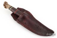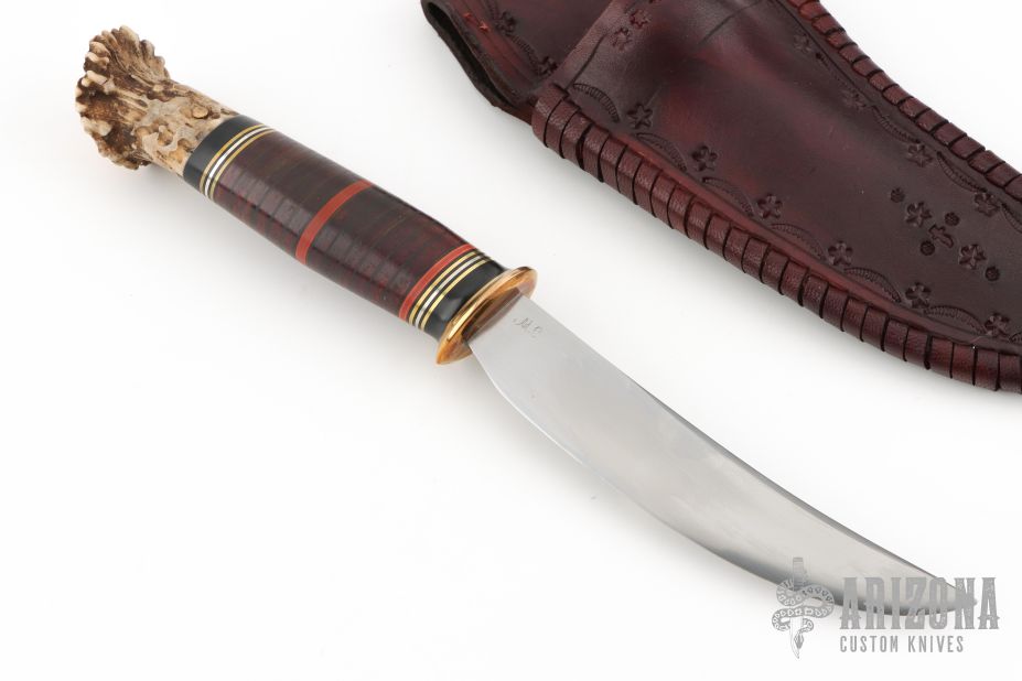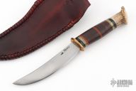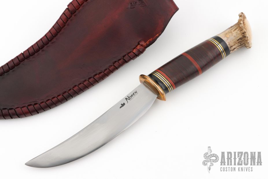 This hunter by Master Smith Doug Noren features a hand rub satin finished blade with .229" blade stock and .956" blade depth, hidden tang construction. The handle has a brass guard, crown stag butt and a spacer pattern consisting of black/brass/nickel silver/red/leather. Comes with a hand tooled brown leather sheath. Excellent condition.