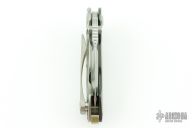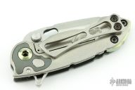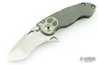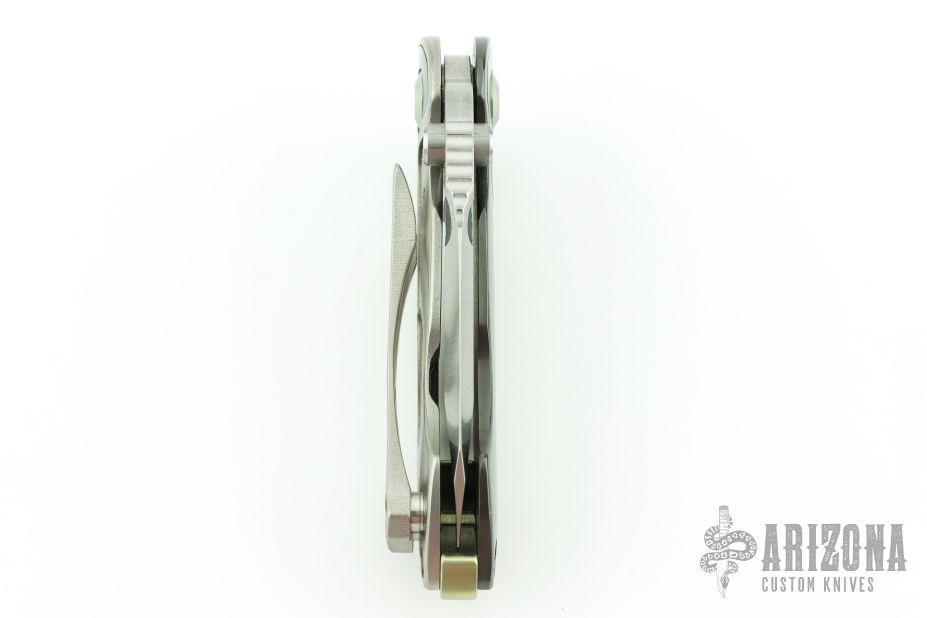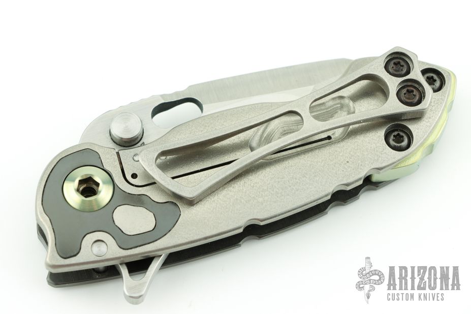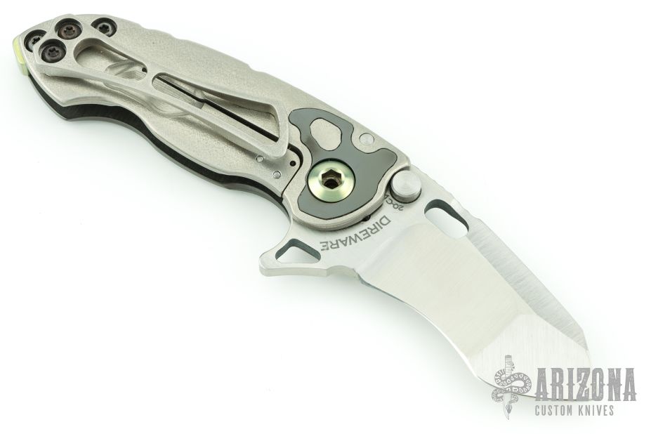 This Mini Solo Flipper by Direware features a satin finished blade with notched thumbrest and a flipper. The handle has a polished zirconium cover with orange peel finished titanium inlay, orange peel finished titanium lock side, zirconium inlay, anodized titanium pivot backstrap and barrel spacers. Has a couple light scratches, excellent condition otherwise.