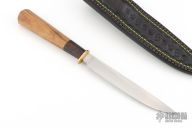 This knife by Joanne Wright forged this hunter from 5160 carbon steel, hand rub satin finished, .157" blade stock and .839" blade depth, hidden tang construction. It was forged closely to shape, ensuring a keen, long lasting edge. A differential heat treatment ensures a hard, keen cutting edge with a softer, resilient spine. The handle has cape black ironwood (Olea capensis) with an Arizona desert ironwood spacer. Black ironwood is an African tree species in the olive family. It has a nice bright tone with darker figure. The handle fills your hand and provides a comfortable grip. A small oval brass guard prevents your hand from sliding over the blade. To keep the knife close at hand, a tooled pouch style leather custom sheath made by Joanne is included. Excellent condition.