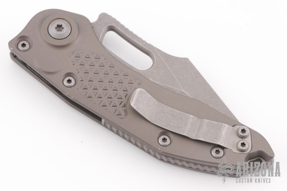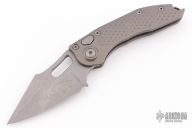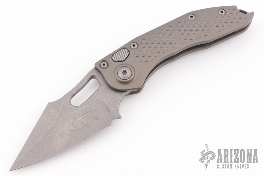 This Stitch Auto by Microtech Knives features an Apocalyptic finished blade and false top edge, notched thumb and finger rests. The handle has a "Natural Clear" milled aluminum handle with a bead blasted titanium backspacer and a bead blasted stainless steel clip, tip up carry, lanyard hole at the butt. Includes original box and papers.  S/N of 14797 and dated 10/2023. Excellent Condition.