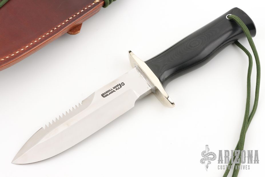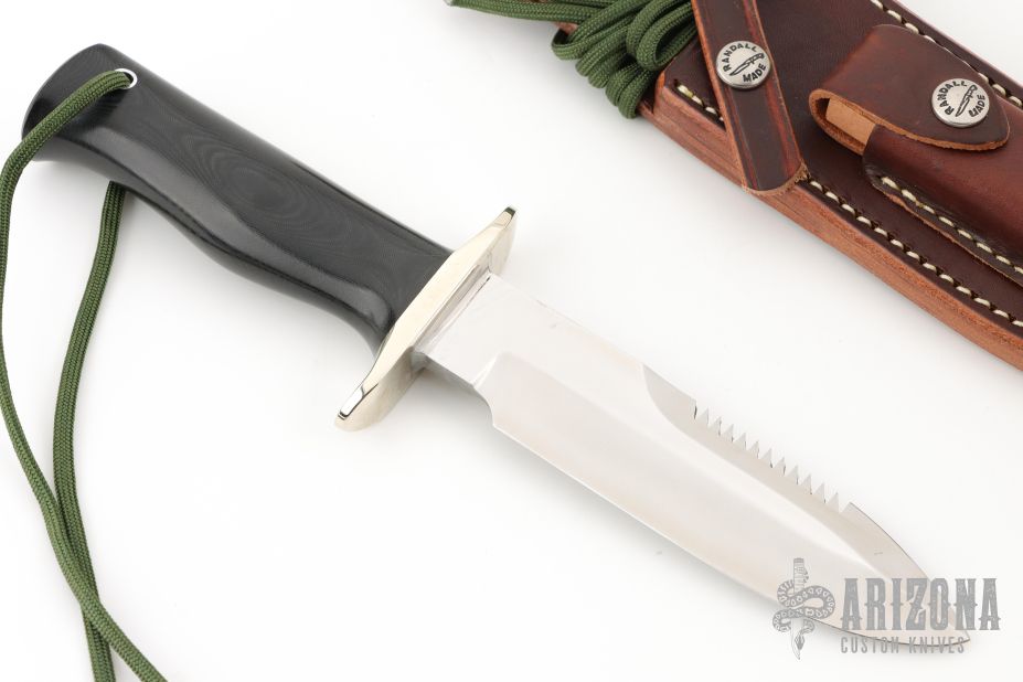 This Model 15 from Randall Made Knives features a satin finished spear point blade with sharpened top edge and sawteeth, .253" blade stock and 1.279" blade depth, full tang construction. The handle has a nickel silver guard and black linen micarta border patrol style handle. Comes with a brown leather sheath and original paper wrapping. New from maker.