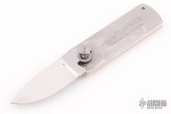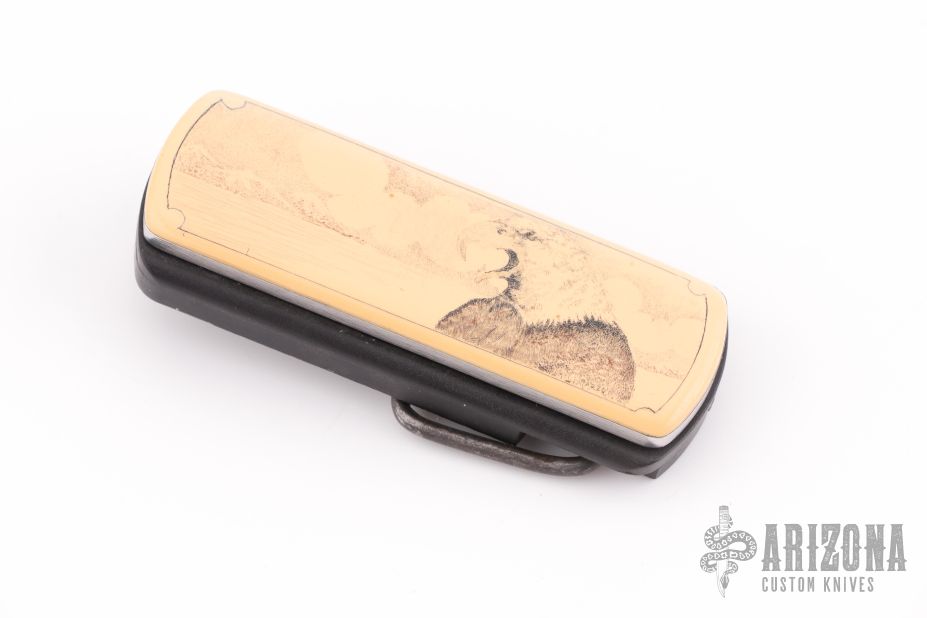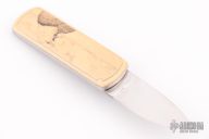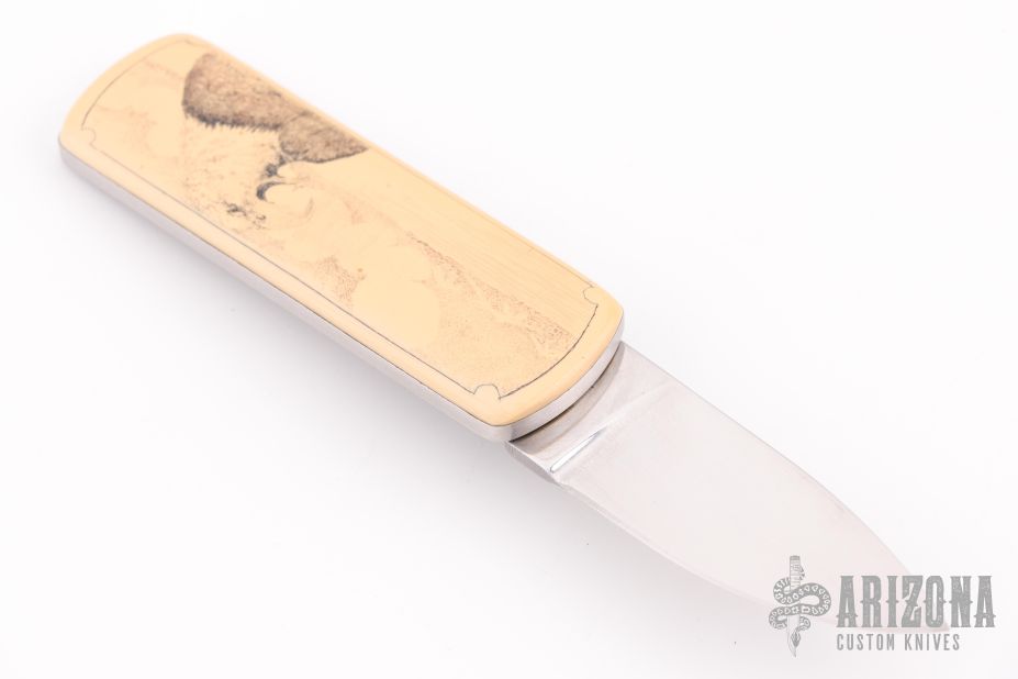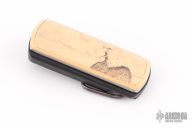 This Touche Belt Buckle Knife by Gerber has a black buckle with wood inlays. The knife has a lovely scrimshaw by Boucher on ivory paper micarta. Drop point blade. Has scuffs/scratches otherwise the knife is in good condition for its age.