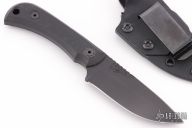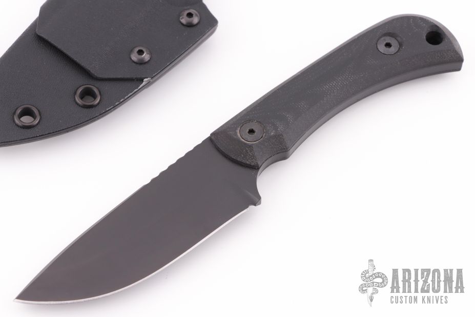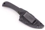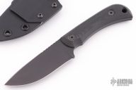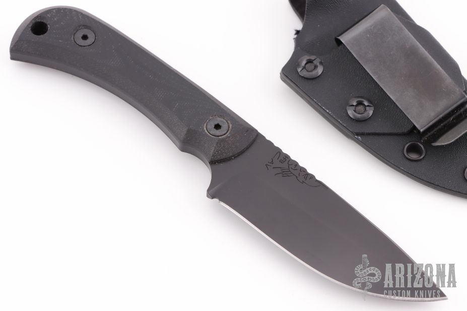 This Cav Jr by Half Face Blades features a black coated blade with a notched thumbrest, .149" blade stock, 1.265" blade depth, full tang construction.  The handle has black G10 scales.  Comes with a kydex sheath with clip. Excellent condition.