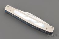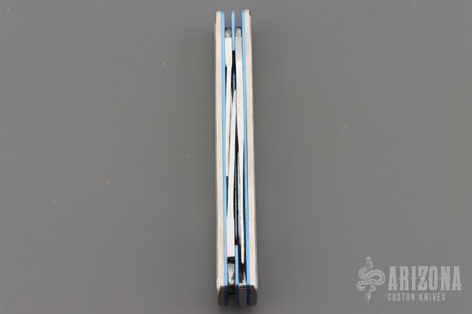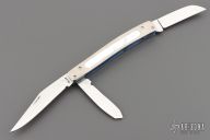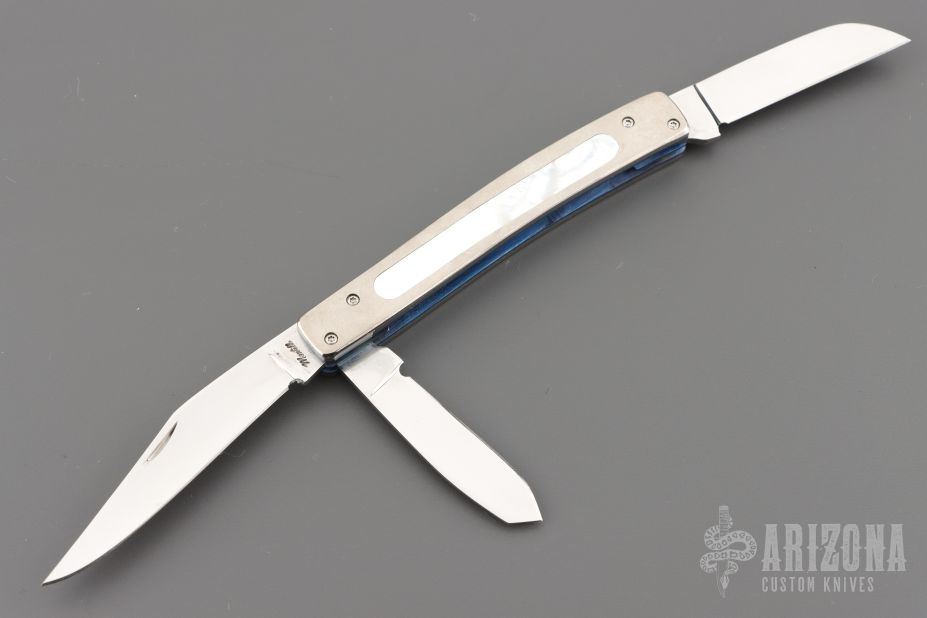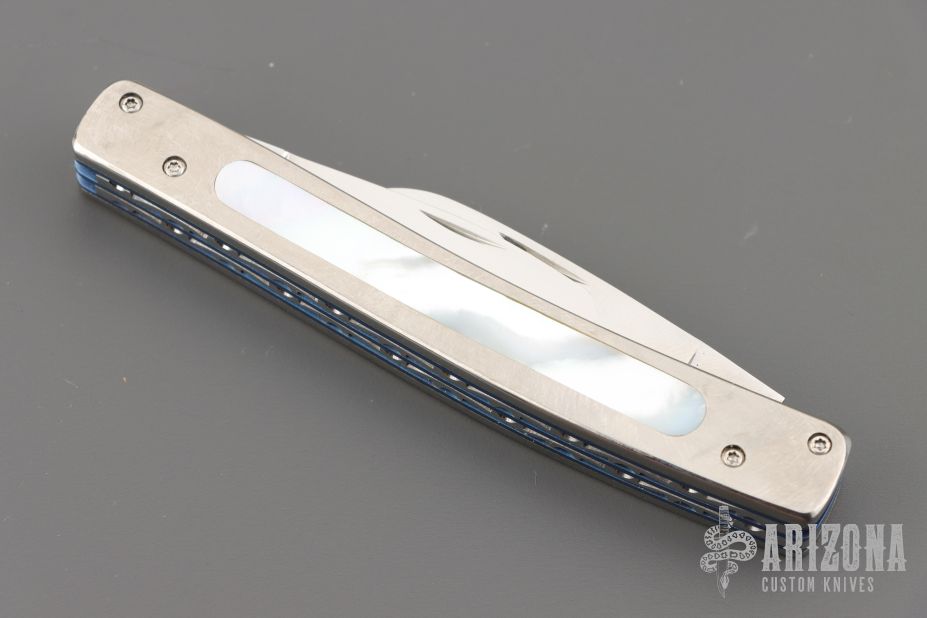 This slipjoint by Ty Montell features mirror finished blades with nail nicks. The handle has titanium covers, black lip pearl inlays, and fileworked stainless steel springs. Has half-stop. Has some light scratches, otherwise Excellent condition. Ty Montell no longer makes 3-blade knives.