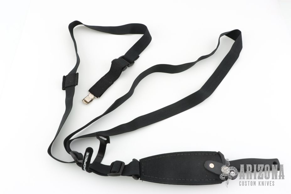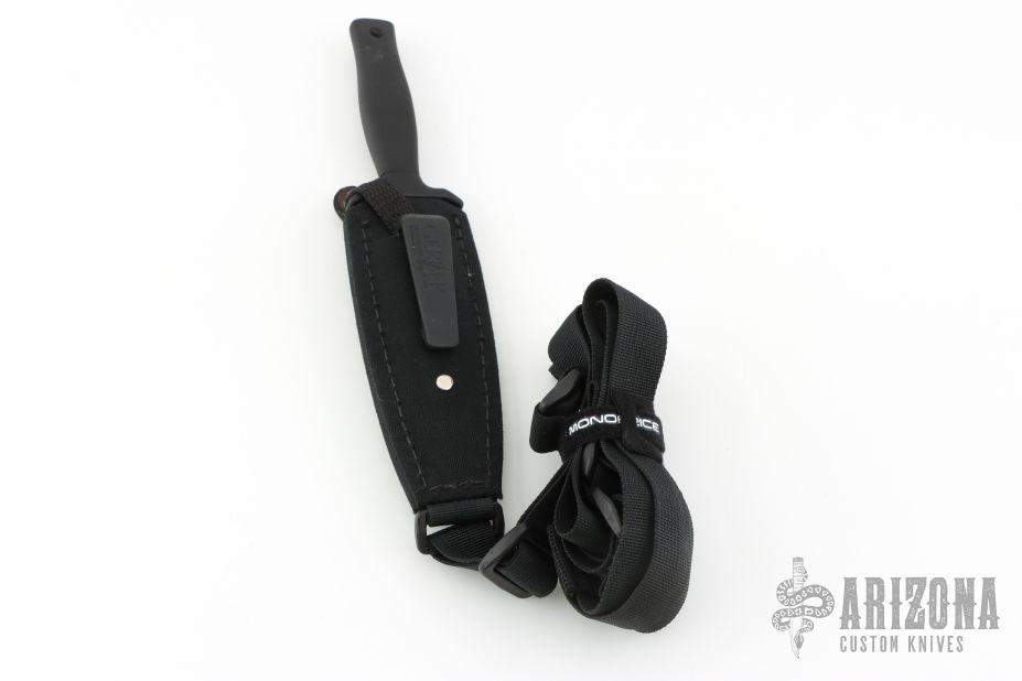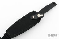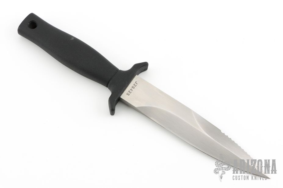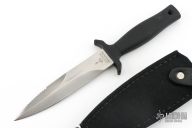 This Command I Boot Knife has a satin finished stainless steel spear point partially serrated blade with hidden tang. .235" Blade Stock.  .943" Blade Depth.  The handle is black aluminum with double guard and lanyard hole.  Comes with a black nylon sheath with button closure and belt clip and a shoulder harness. Excellent condition.