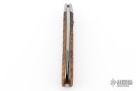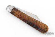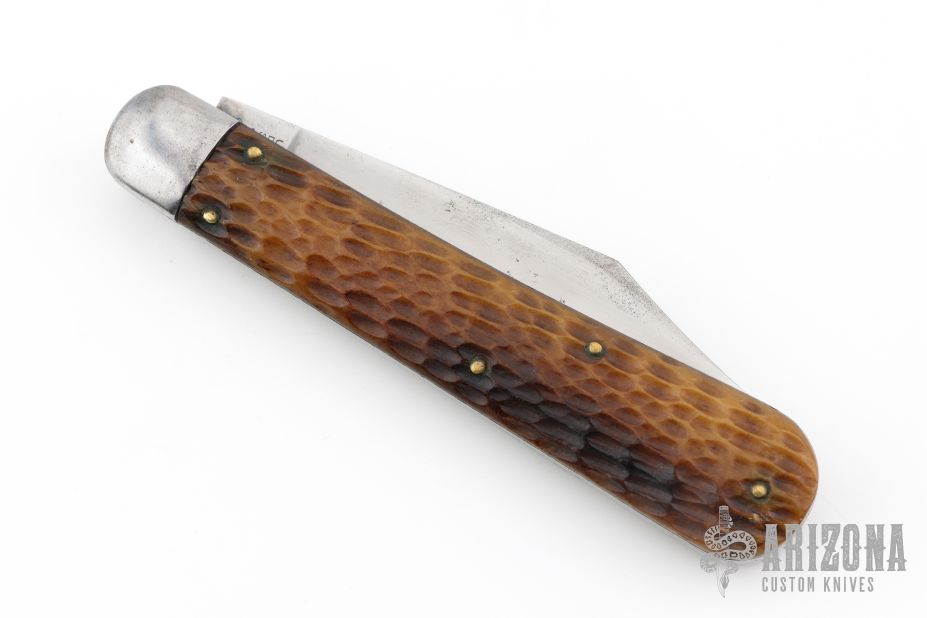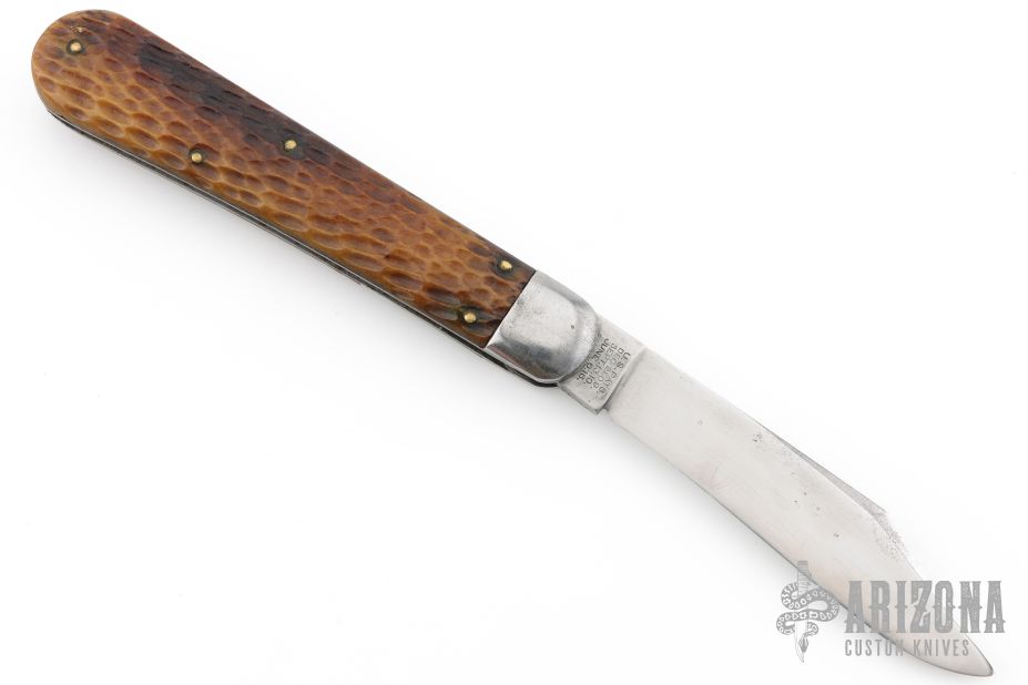 This antique auto by Schrade features a clip point blade. The handle has steel bolsters, jigged bone scales, steel liners and backspacer, has safety. Nice action and blade seating. Has light scratches and a little blade play, otherwise excellent condition for its age.