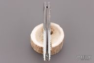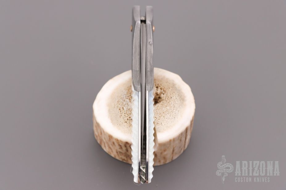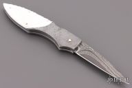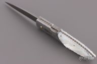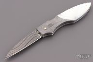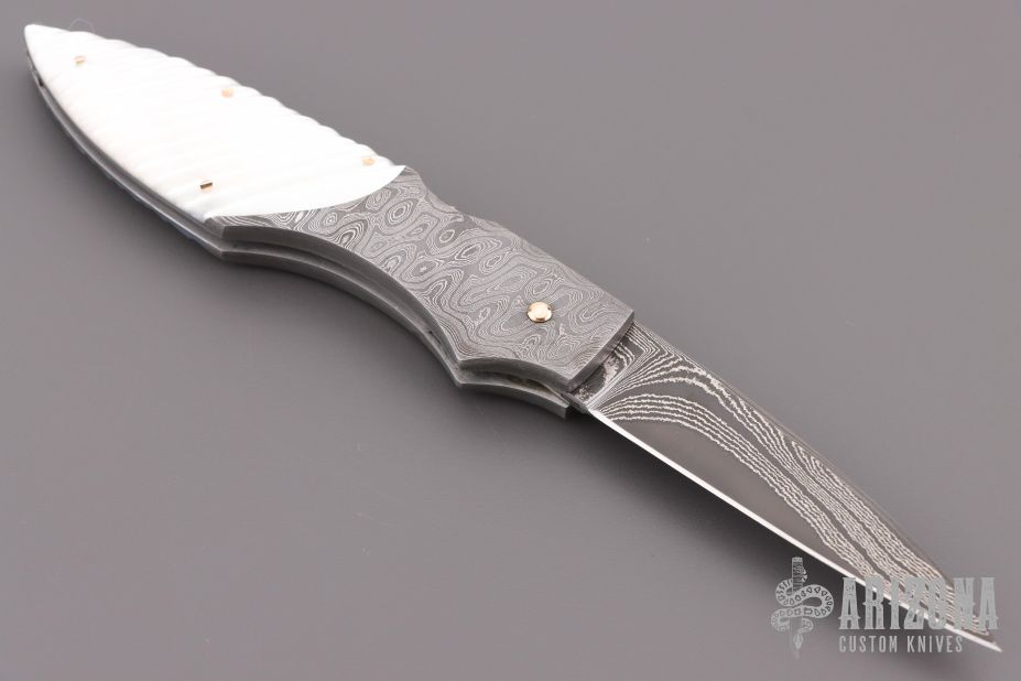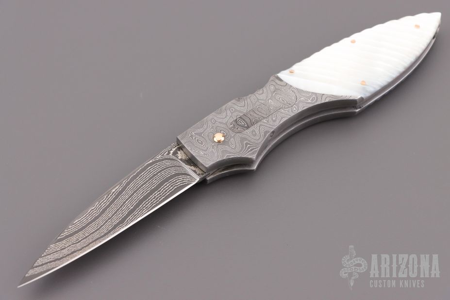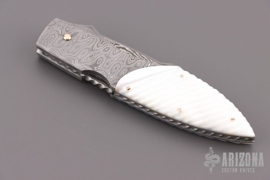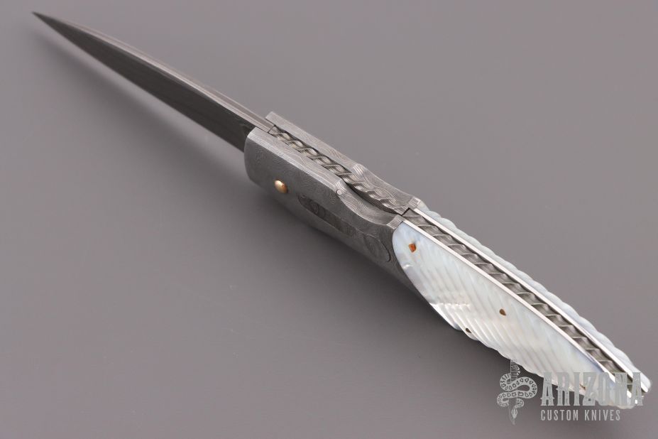 This Gentleman's Pocket Auto by Joe Kious features a Damascus blade. The handle has Damascus bolsters, fluted mother-of-pearl scales, gold pivot and pins, fileworked Damascus back spring, stainless steel liners. Excellent Condition.
