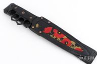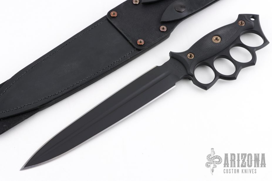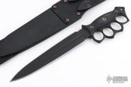 Embodying history and our own design philosophies, Lady Death is our rendition of the classic trench knife. We decided to go big, like no other, with a 15" overall length, and 9 5/8" CPM-3V double-edge dagger blade with a long fuller down the middle. The knuckle duster style handle acts as a guard to protect your hands, and the aggressive outward shape works well for raking. To round out the overall shape, the end of the handle features a pronounced pommel for hammer-striking. The handle is finished with G10 scales with a checkered texture that is suitable in dry or wet conditions. The handles are attached with Grade 5 Titanium fasteners that are electro-anodized in bronze to round out the look. Lady Death includes a leather sheath with a contrasting inlay. The sheath is ambidextrous, and can be worn on a belt or attached to PALS webbing.