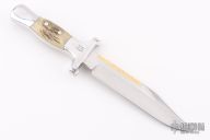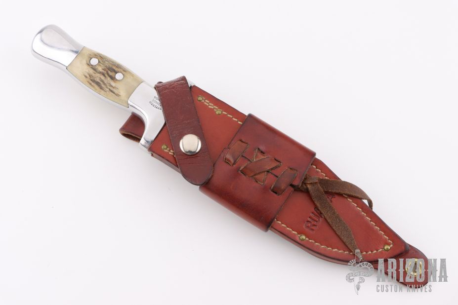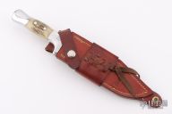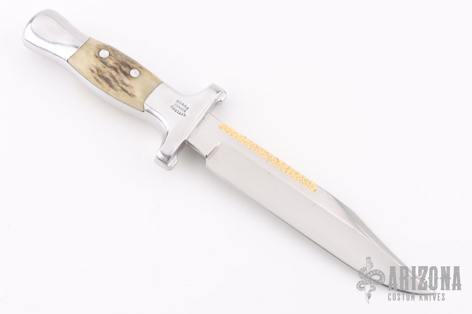 This 29A Junior Bowie by Rudy Ruana features a satin finished blade with a sharpened top edge and hammered brass parry guard, .231" blade stock and 1.187" blade depth, hidden tang construction. The handle is cast from aluminum with elk inserts. Comes with brown leather sheath. Excellent condition.