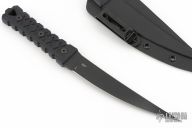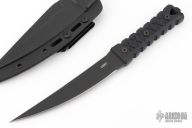 This HZ6 by CRKT is a Williams Blades design, it has a black upswept blade with notched thumb ramp, .212" blade stock and 1.25" blade depth, full tang construction. The handle has textured g10 covers with lanyard bail in pommel. Comes with a Kydex sheath and original box. Excellent condition.