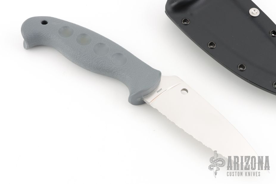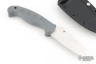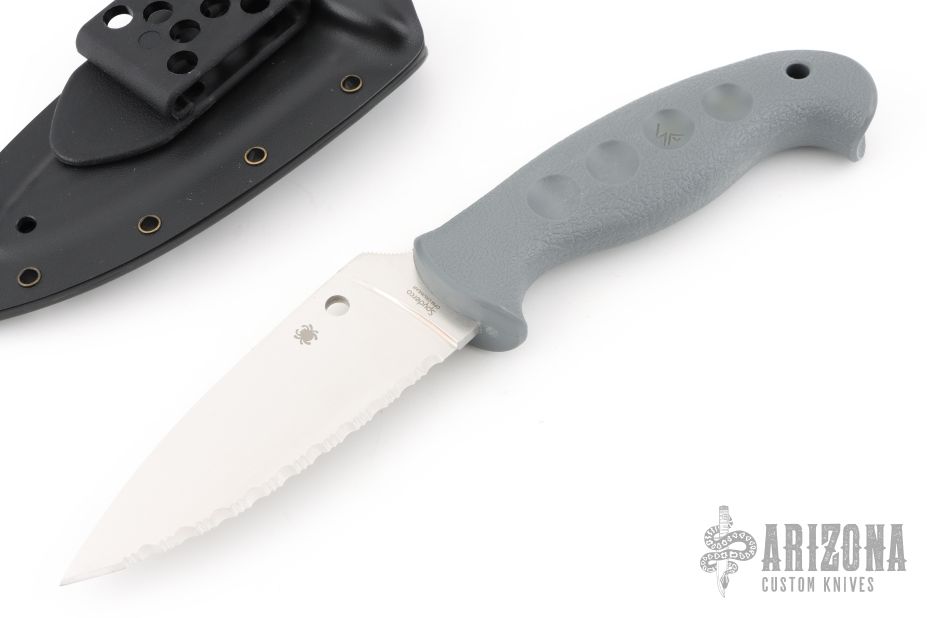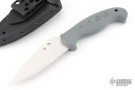 This Temperance from Spyderco features a satin finished drop point blade with notched thumbrest and fully serrated edge, 1/8" blade stock and 1 3/8" blade depth, full tang construction. The handle is gray FRN. Comes with kydex sheath, original box, and papers. Excellent condition.