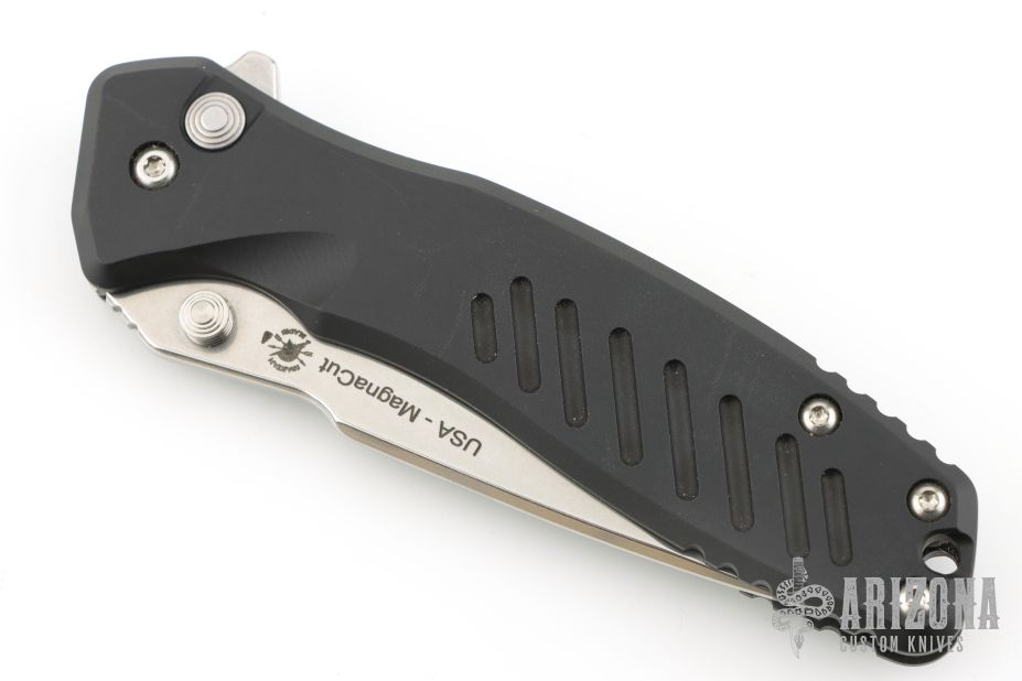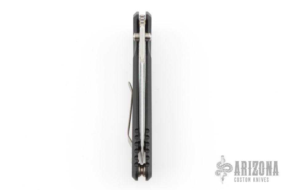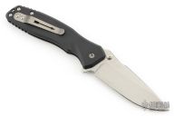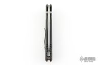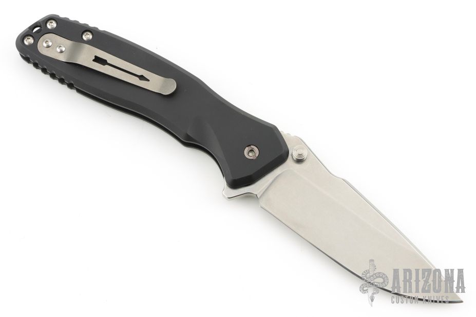 This PALLAS button lock from Spartan Blades features a tumble finished clip point blade with swedge, dual thumb studs, notched thumb rest and flipper. The handle has a milled and black anodized aluminum frame over stainless steel barrel spacers. Titanium tip up clip and lanyard hole in pommel. Excellent condition. Comes with original box.