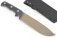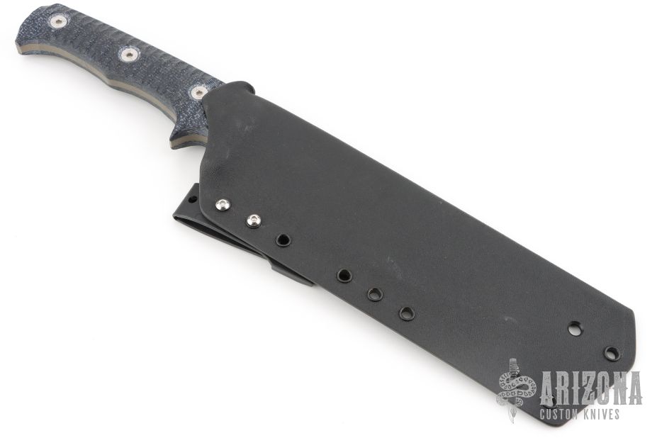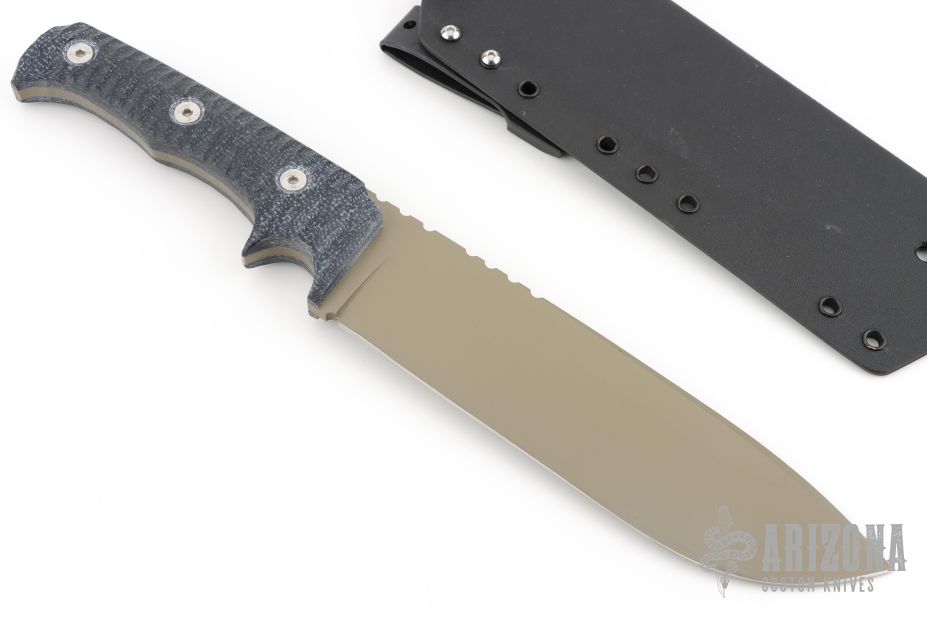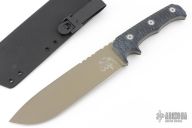 This Dimorphodon by Wander Tactical features an FDE coated blade with notched thumbrest, .205" blade stock and 2.012" blade depth, full tang construction. The handle has blue canvas micarta scales. Comes with a Kydex sheath. Has a couple light scuffs, otherwise excellent condition.