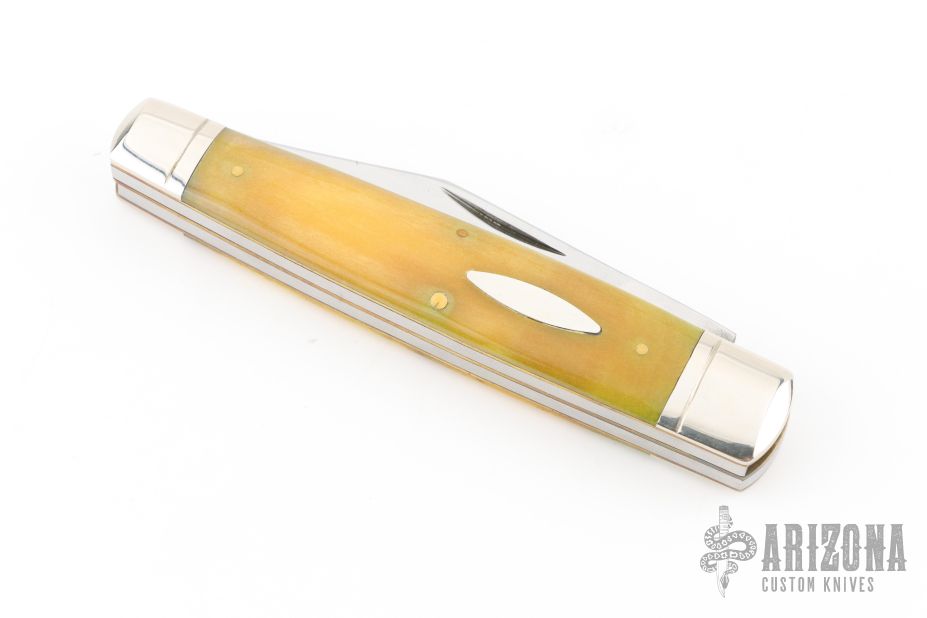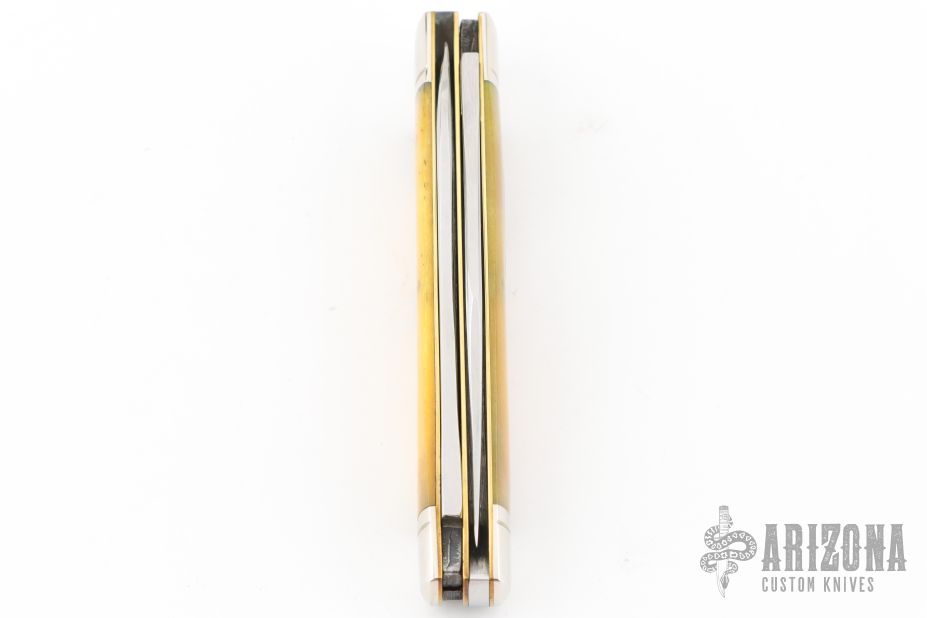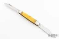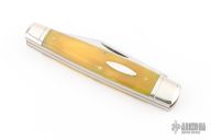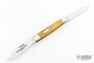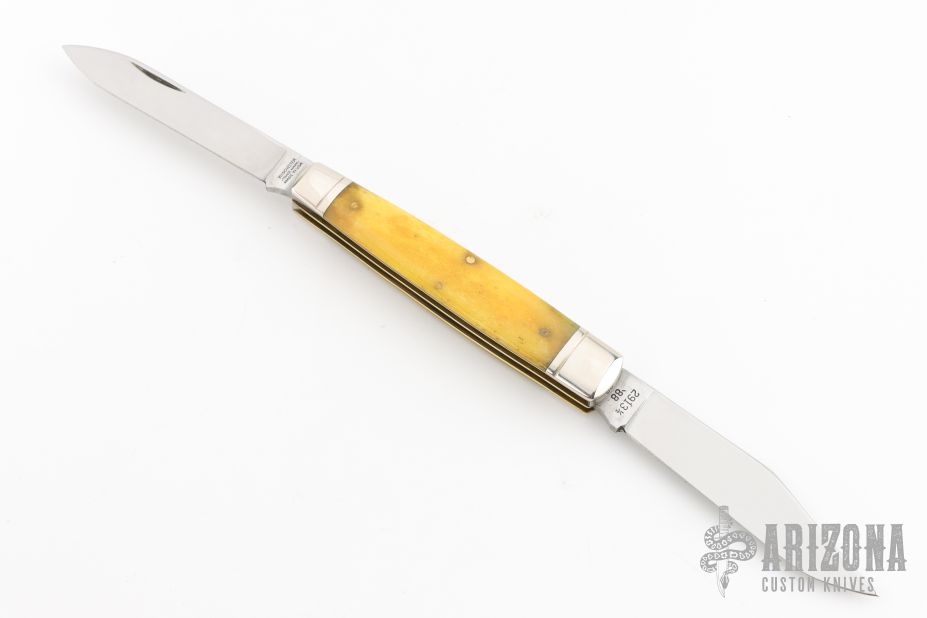 This 2-Blade Moose by Winchester knives features mirror finished blades with nail nicks. The handle has nickel silver bolsters, yellow bone scales, brass liners, stainless steel springs. Comes with original box and papers. Has some light scratches, Excellent condition.