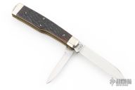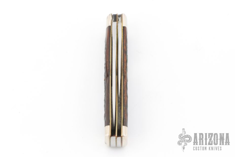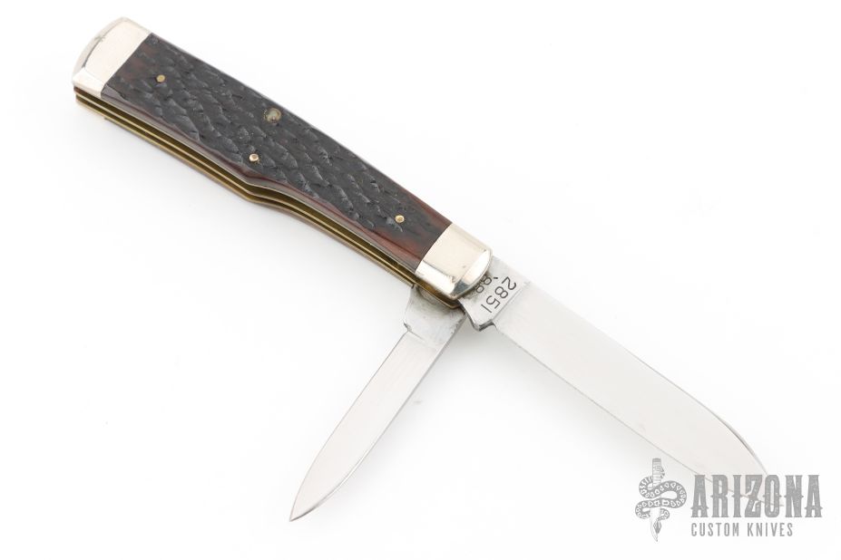 This Winchester folder features two mirror polished blades. Nickel Silver front and rear bolsters with jigged bone covers. Brass liners and steel spring. Original box. Excellent condition.
