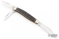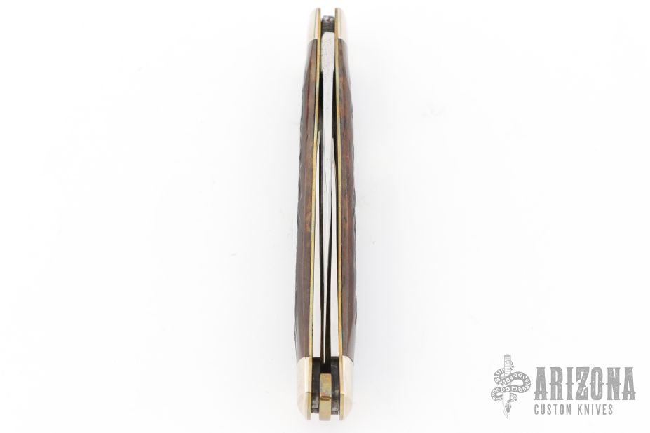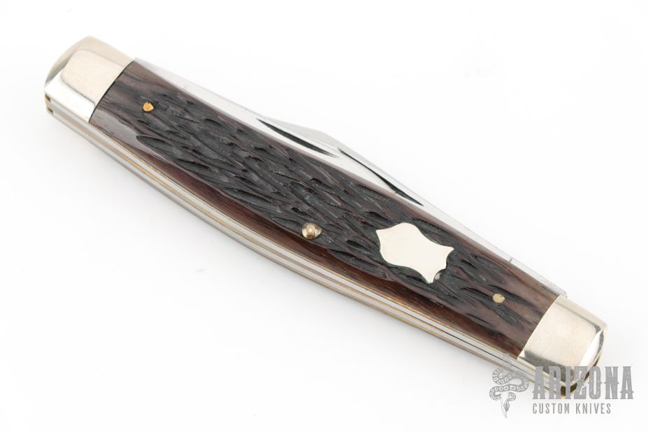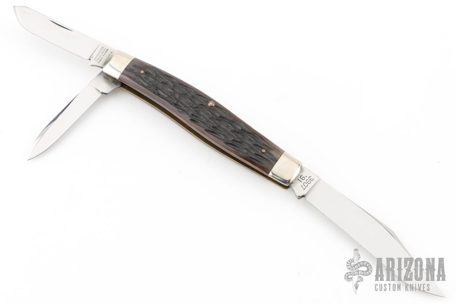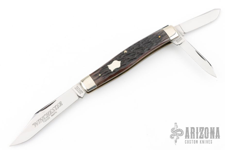This Winchester folder features three mirror polished blades. Nickel Silver front and rear bolsters with jigged bone covers. Brass liners and steel springs. Original box. Excellent Condition.