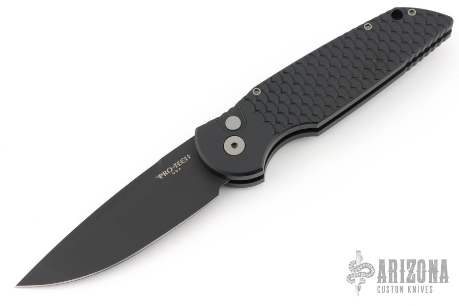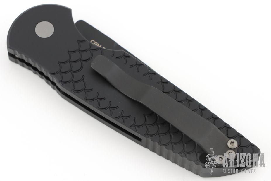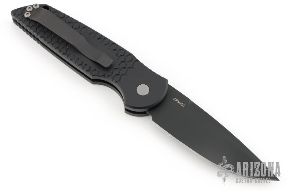 This TR-3 X1 by Pro-Tech Knives features a black spear point blade. The handle has a black aluminum handle with stainless steel backspacer with lanyard hole, tip up blade stainless steel clip. Includes the original box and papers. Excellent condition.