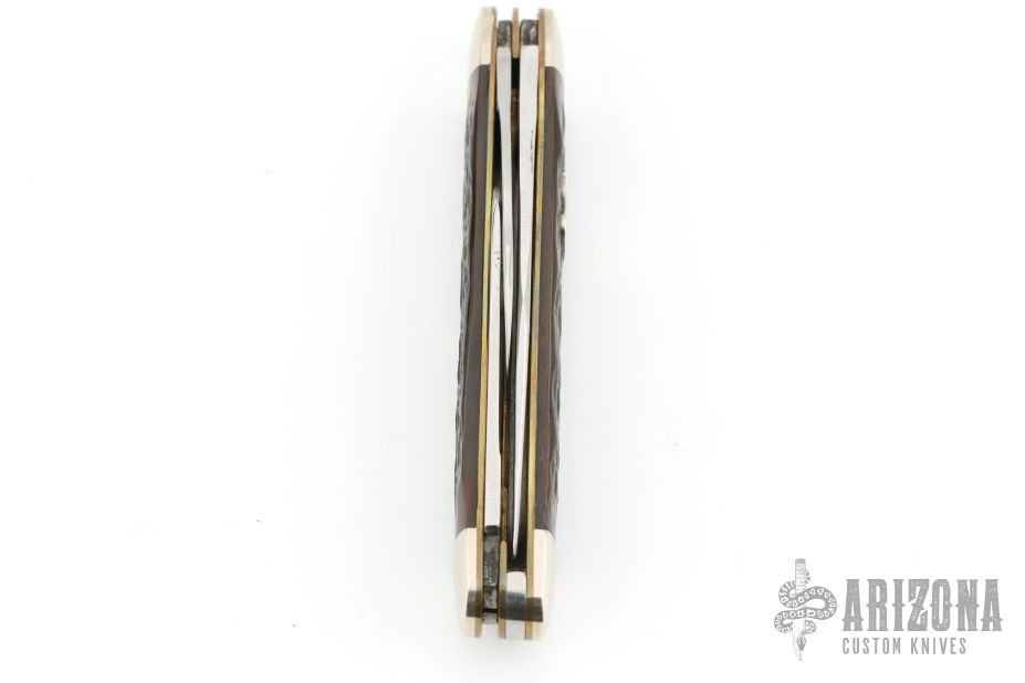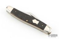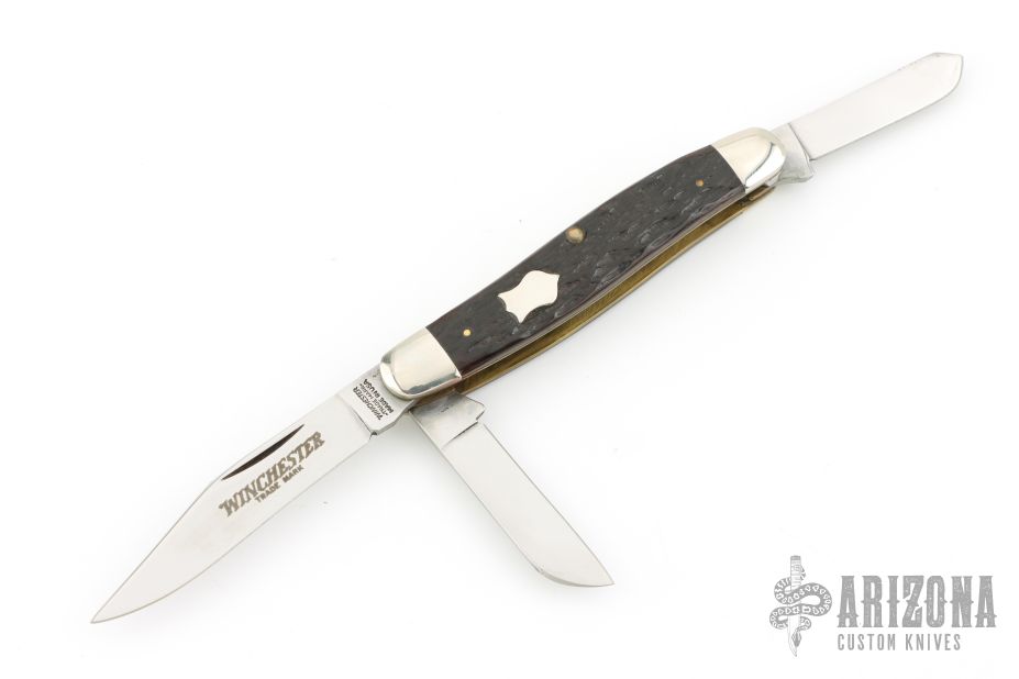 This Winchester 3-Blade Whittler features three mirror polished blades with nail nicks. Nickel Silver front and rear bolsters with Rogers dark brown jigged bone covers. Brass liners and steel spring. Original box. Excellent condition.