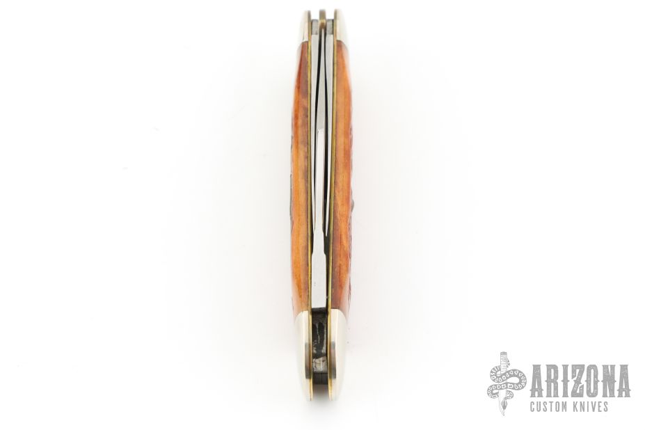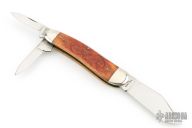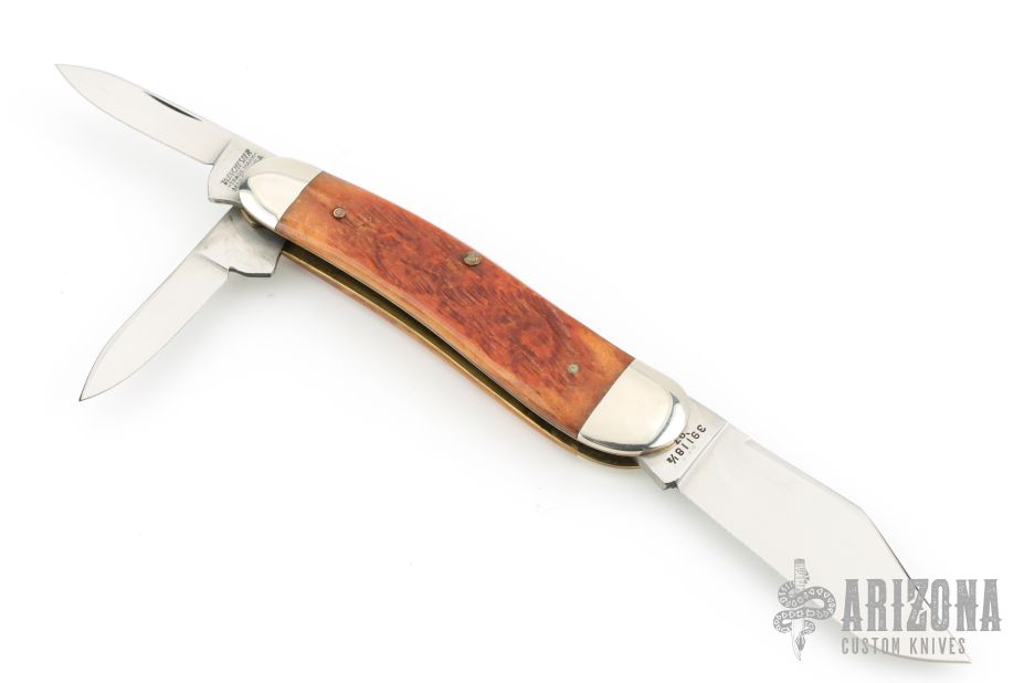 This Winchester whittler features three mirror polished blades with nail nicks. Nickel Silver front and rear bolsters with amber/orange jigged bone covers. Brass liners and steel spring. Original box. Excellent condition.