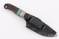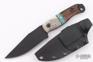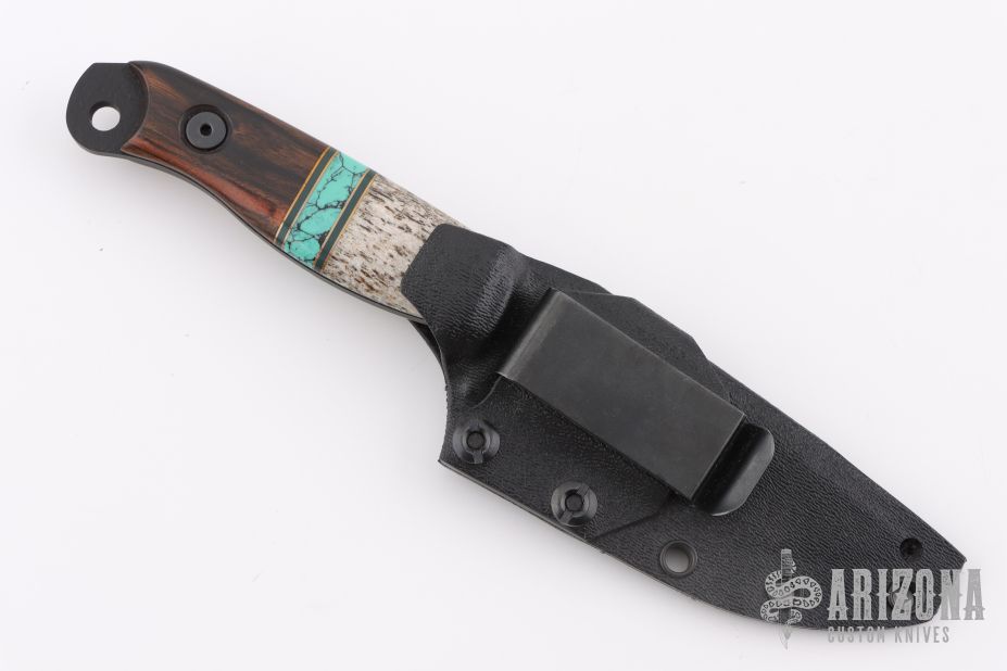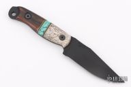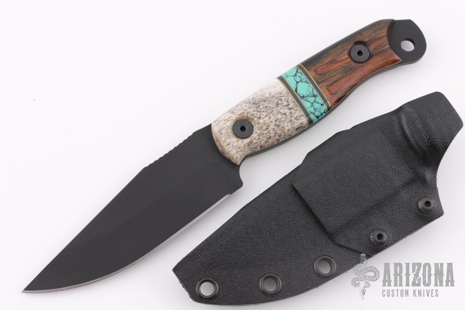 This Crow Scalper by Half Face Blades features a black cerakote finish blade with notched thumbrest, .131" blade stock, 1.270" blade depth, full tang construction. The handle has multi-piece scales with elk horn, ironwood, black/copper/turquoise spacers. Comes with kydex sheath. Excellent condition.