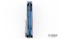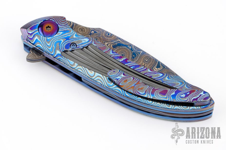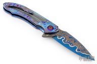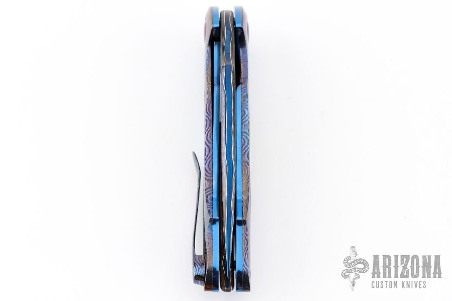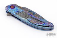 This knife by Peter Martin features a sole authorship San Mai Damascus blade and matching backspacer. The handle has zircuti scales and tip-up pocket clip over anodized titanium liners.  Zirconium inlays.  Nice detent lock up and blade seating.  Excellent Condition.
