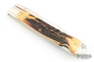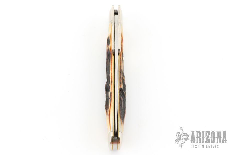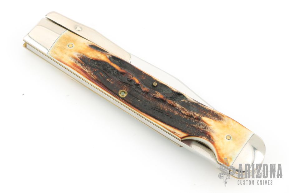 This swing guard lockback by Northwoods Knives features a polished  blade with swedge and nail nick. The handle has nickel silver bolsters, guard, stag covers, brass liners and stainless steel spring.  Includes cloth slip sheath and original box. Excellent condition.