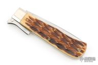 This Bullhead leverlock trapper by Great Eastern Cutler features a satin finished blade with nail nick. The handle has nickel silver bolsters, frontier bone covers with a nickel silver escutcheon, brass liners and pins, steel spring. Comes with original tube and paper. Excellent condition. 1 of 28 made.