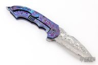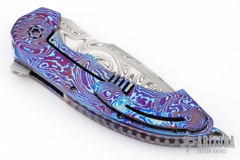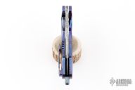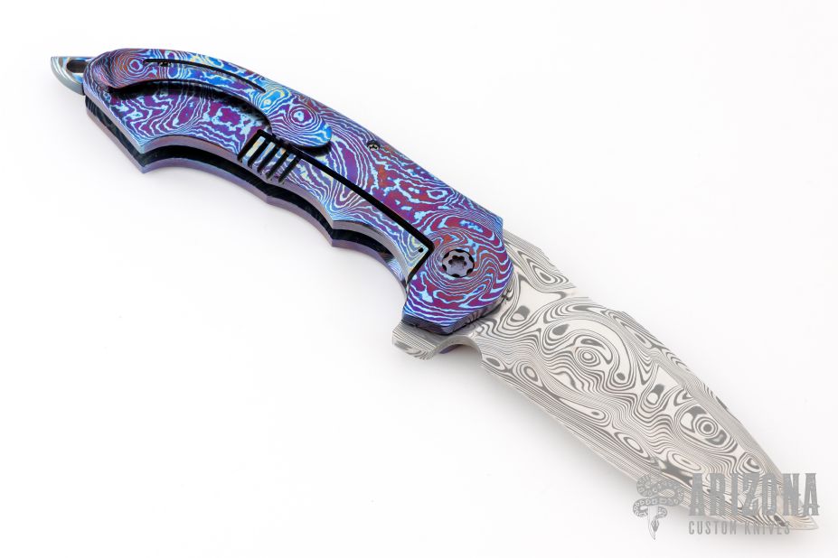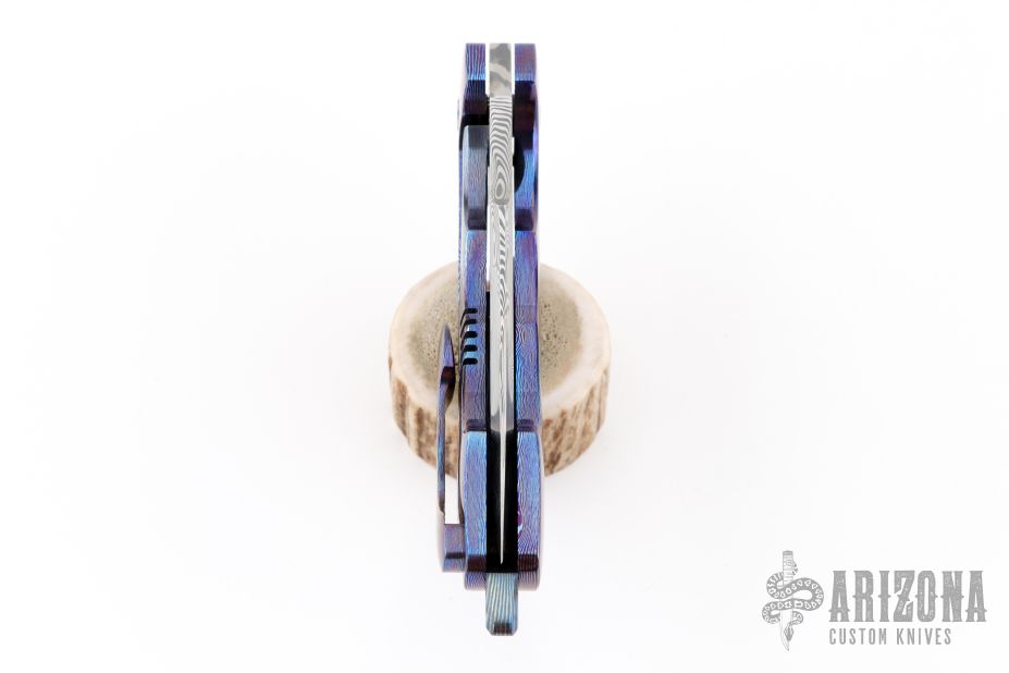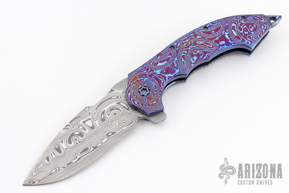 This gorgeous Archangel from Mr. Fischer features a Grosserosen Damasteel recurve blade with false top edge, notched thumbramp and flipper. The handle has a "Wavepool" MokuTi  frame with a notched ZircuTi backspacer, and a tip up MokuTi clip with hidden screws. Blade is centered when closed and locks up with no play. Nice crisp detent. Very smooth action thanks to Mr. Fischer's bearing system. Excellent condition.  Only 2 of these were made as framelocks.