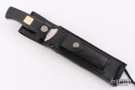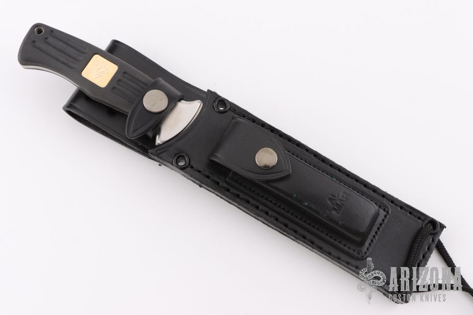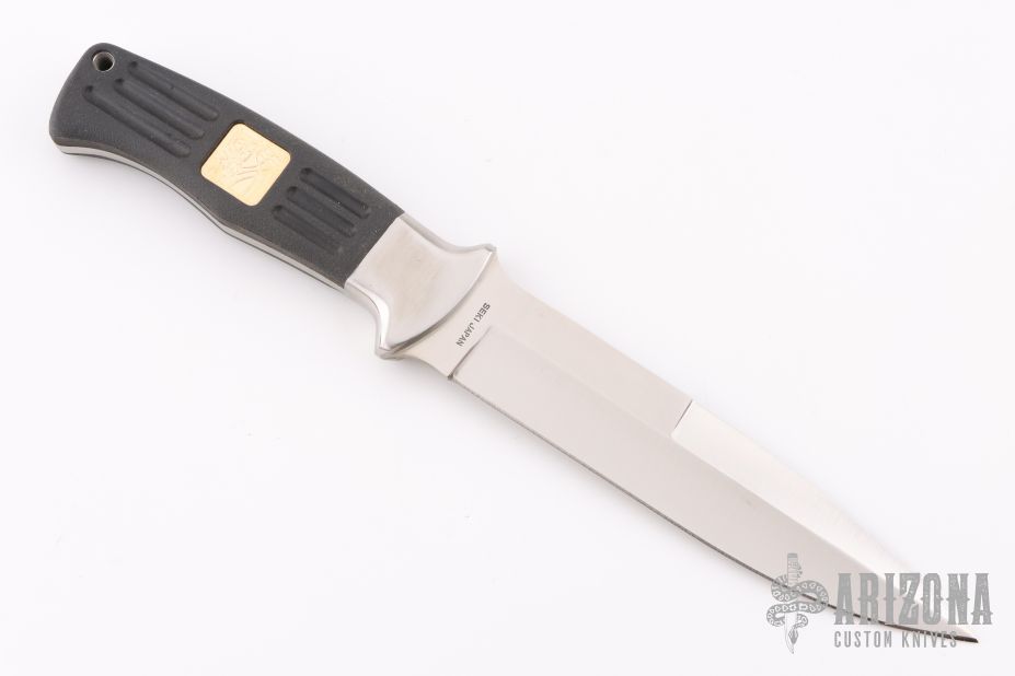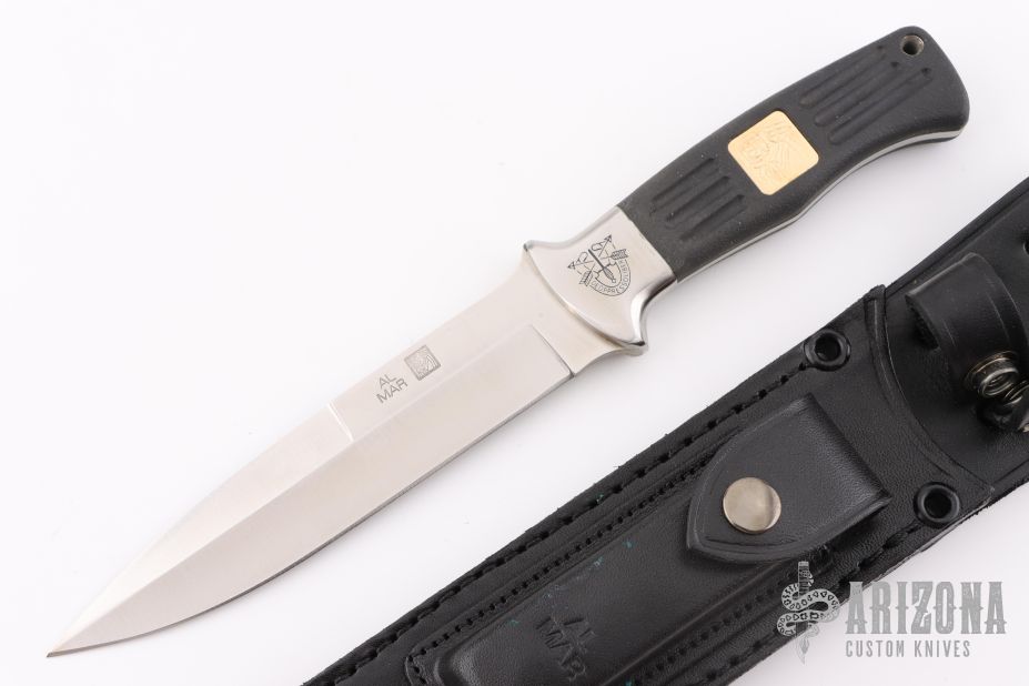 This SERE fixed blade from Al Mar Knives features a satin finished blade with false top edge, .159" stock and 1.173" depth, full tang construction. The handle has rubber scales, stainless steel bolsters. Comes with original box and black leather sheath. Excellent condition.
