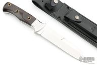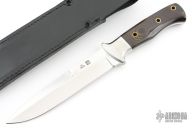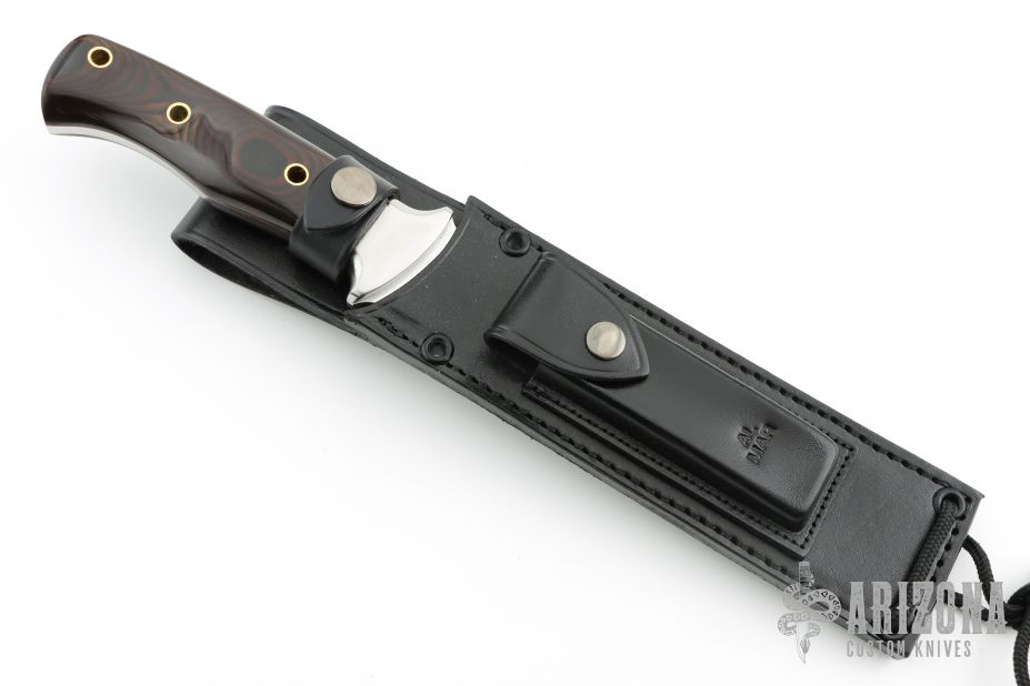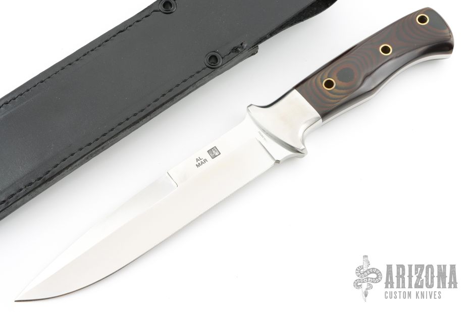 This SERE fixed blade from Al Mar Knives features a satin finished blade with false top edge, .199" stock and 1.373" depth, full tang construction. The handle has black/brown paper micarta scales, brass tube pins over red liners, stainless steel bolsters. Comes with original box and black leather sheath. Excellent condition.