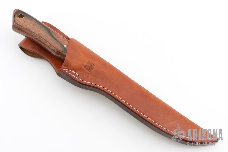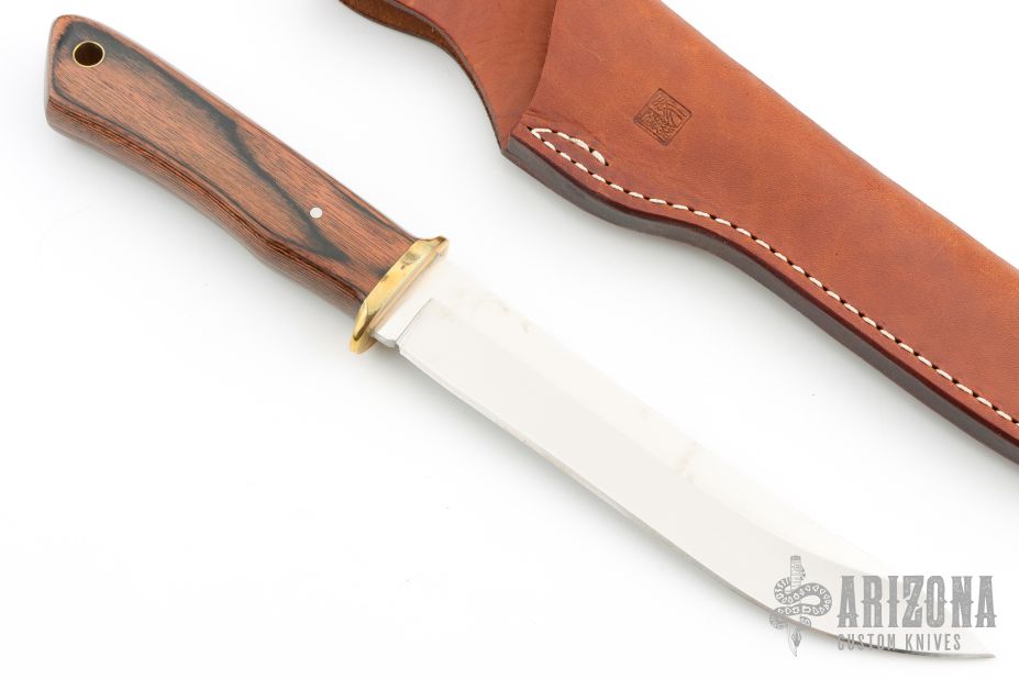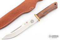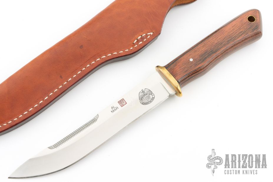 This M50 Border Patrol fixed blade from Al Mar Knives features a satin finished blade and serrations on top, .198" blade stock and 1.123" blade depth, hidden tang construction. The handle has a brass guard and dymondwood grip with a lanyard hole. Comes with original box, papers and brown leather sheath. Excellent condition.