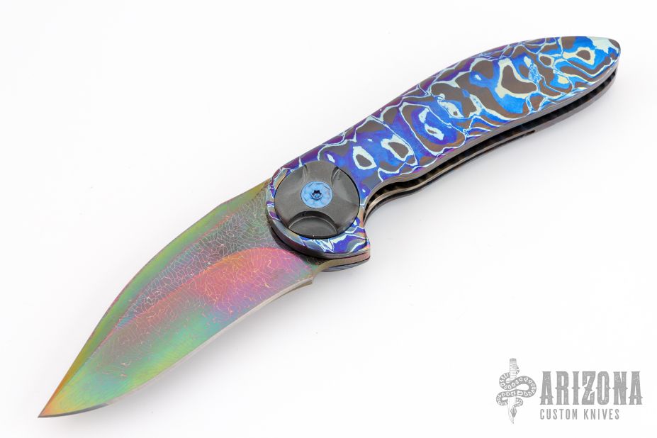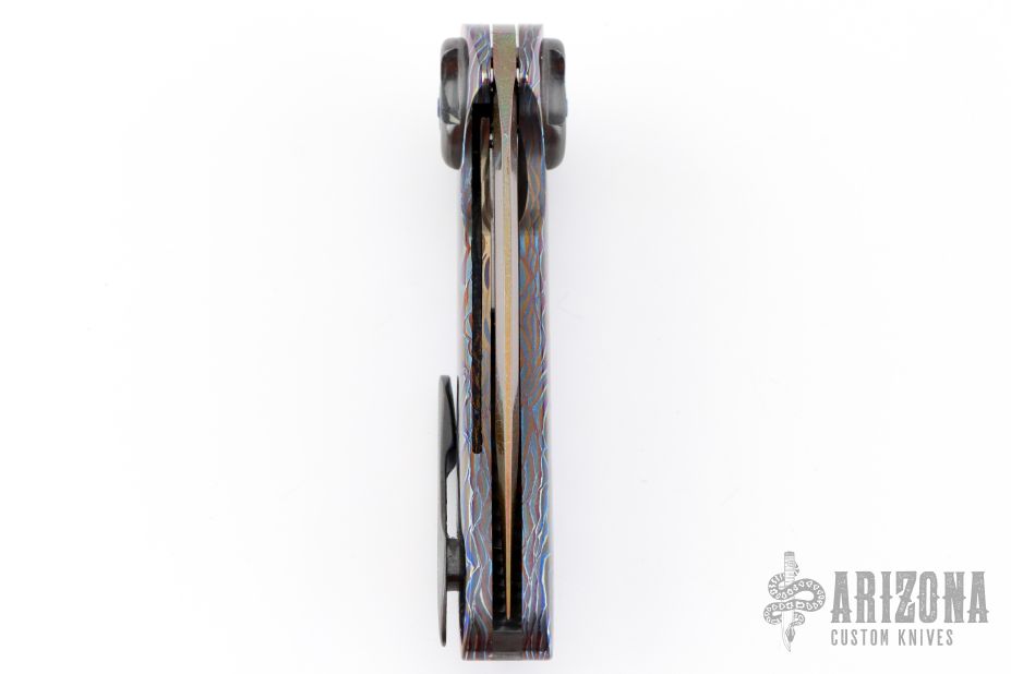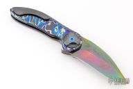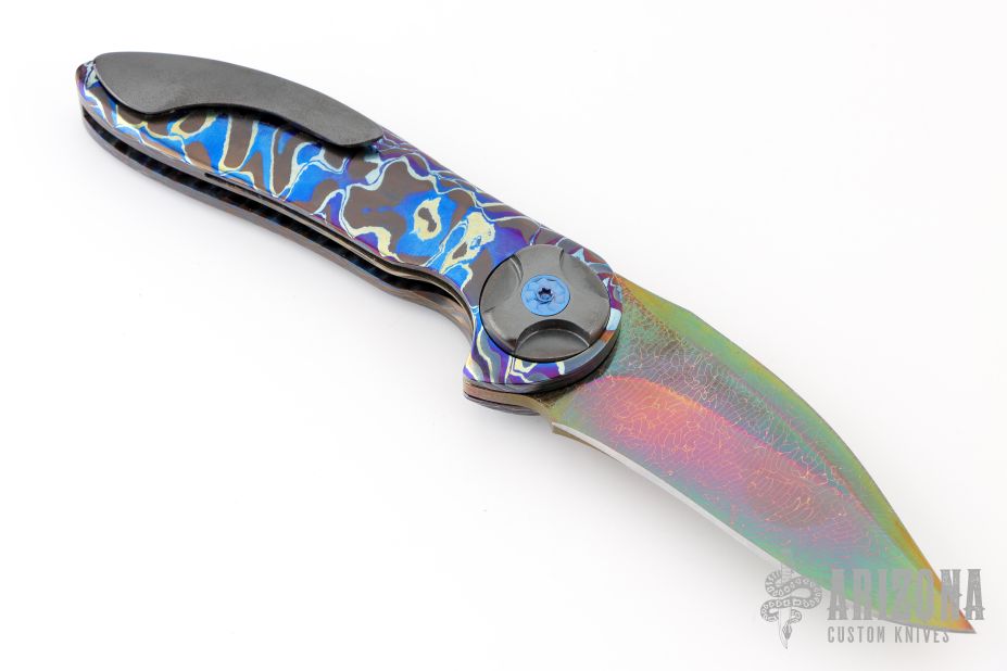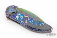 This knife by Glenn Are Hovin features a Damascus drop point blade with false top edge and flipper. The handle has mokuti frame with zircoinum pivot, backspacer and tip up pocket clip. This knife's only hardware visible is the pivot, every other screw on the knife is hidden, pretty impressive and clean. Excellent Condition.