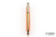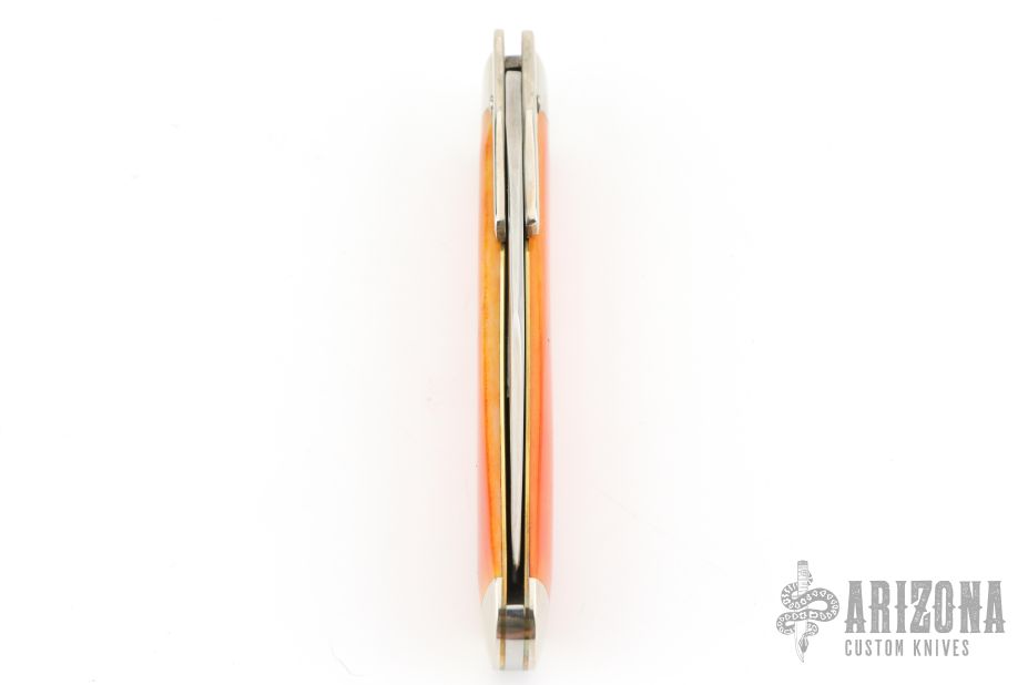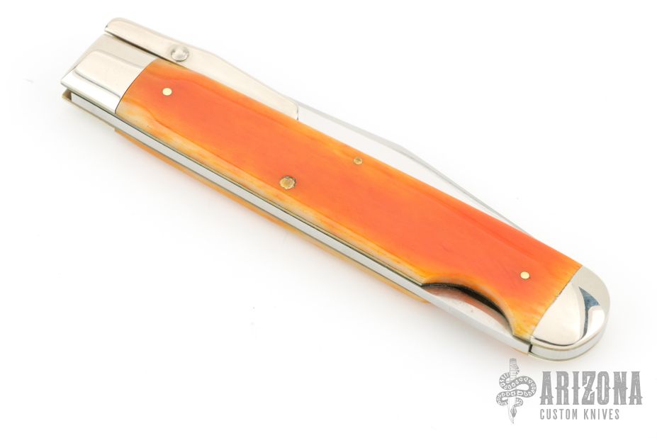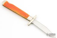 This swing guard lock back by Colonel Coon features a mirror finished blade with nail nick. The handle has nickel silver bolsters/guard, orange bone scales, brass liners, stainless steel spring. Comes with original box. Excellent condition.